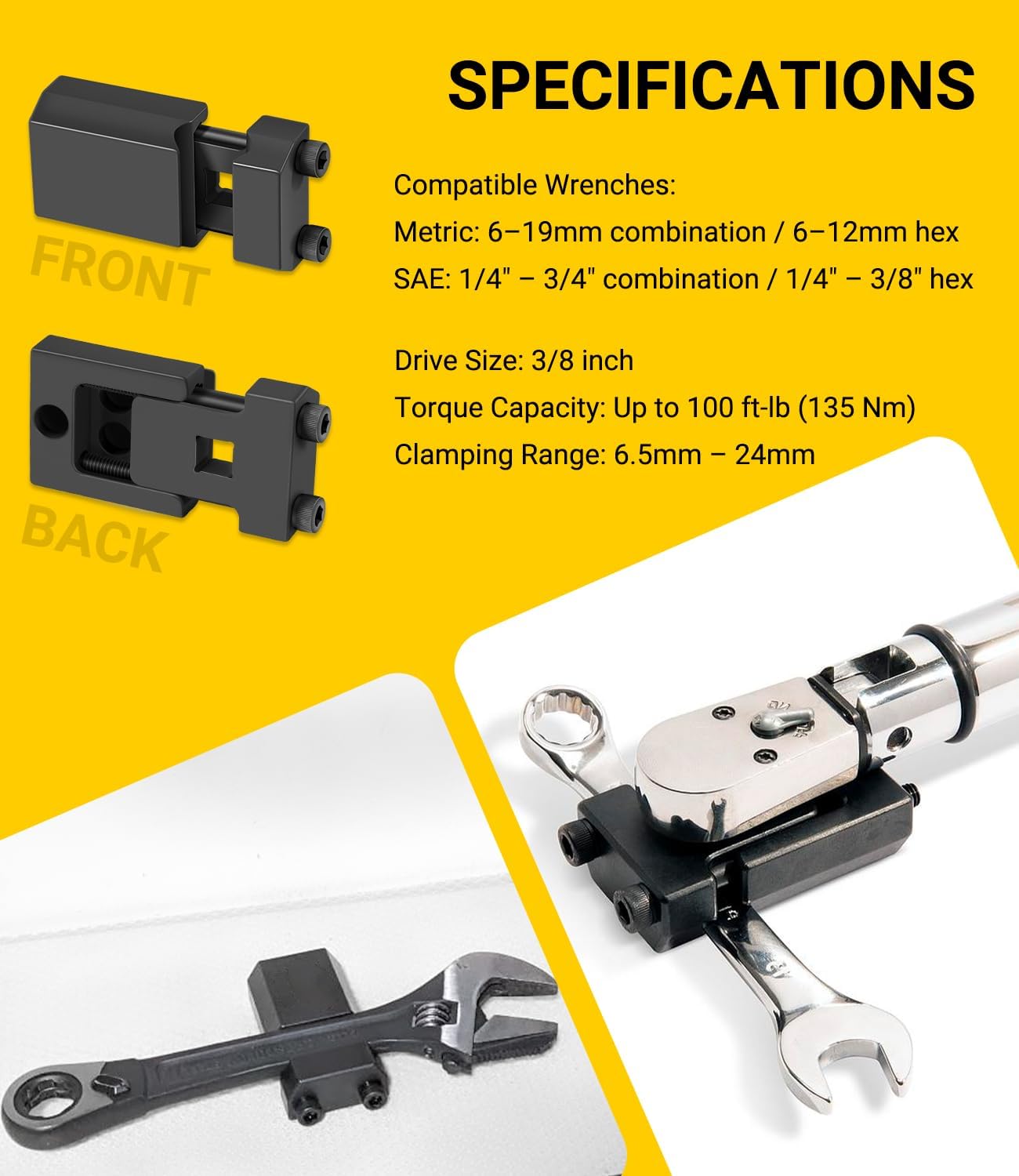 Specifications Drive Size: 3/8 inch Torque Capacity: Up to 100 ft-lb (135 Nm) Clamping Range: 6.5mm – 24mm Compatible Wrenches: Metric: 6mm – 19mm combination / 6mm – 12mm hex SAE: 1/4" – 3/4" combination / 1/4" – 3/8" hex Material: Heat-treated steel Finish: Black oxide Application: Use with torque wrench for accurate torque on hard-to-reach fasteners The 08-0380 Adjustable Torque Wrench Adapter lets you accurately torque fasteners in tight or hard-to-reach areas where standard sockets can’t fit. Designed to work with any 3/8" drive torque wrench, it easily attaches to your existing combination wrenches or Allen wrenches, allowing precise torque application without sacrificing accessibility.