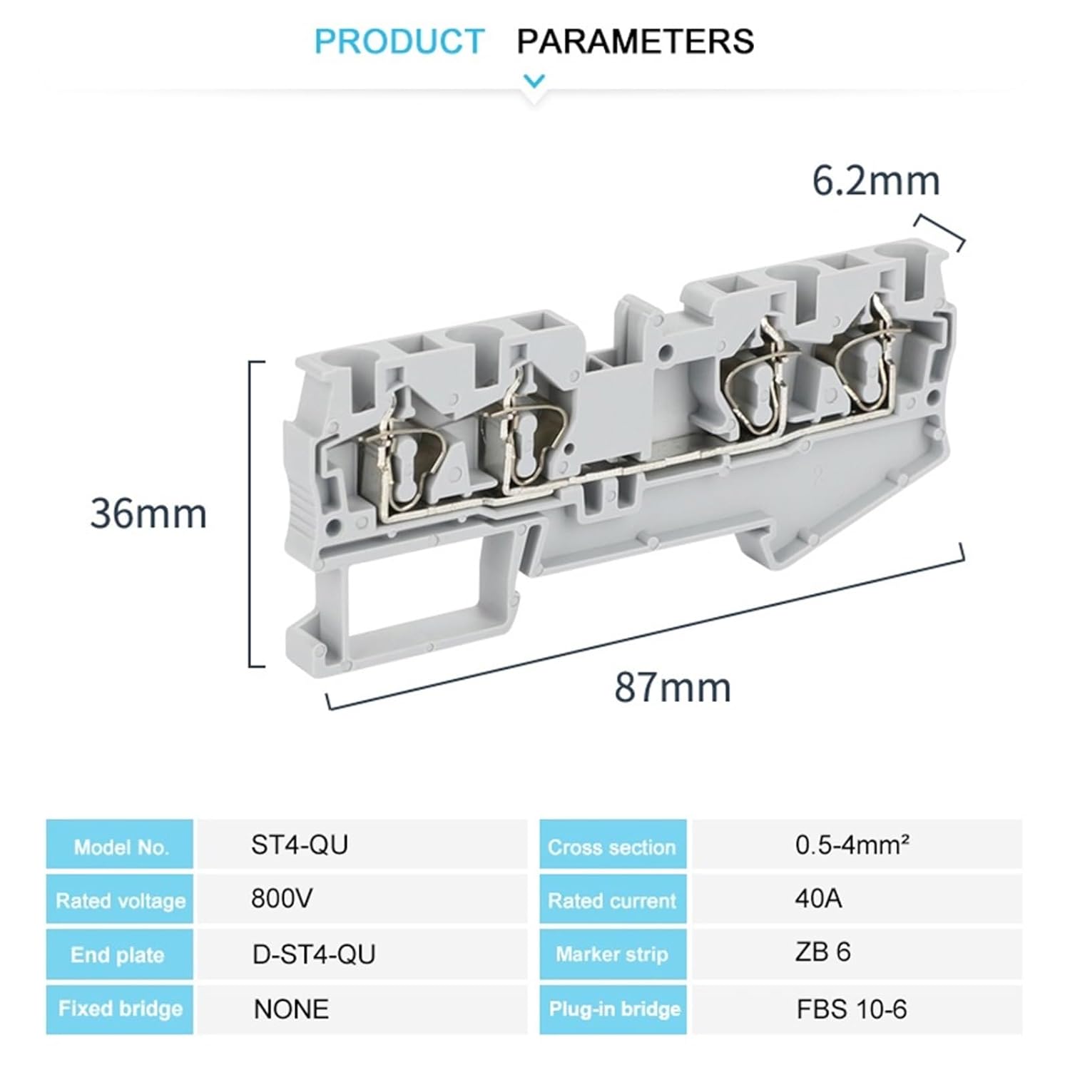 Disconnect BlocksModel Number : ST 4-QU Conductor Size : 20-12 AWGConnection method : Spring-cage connectionRated Voltage/Current : 800V/40AMounting Type : NS 35/7.5Number of Contacts : 1 - 10Type : SpringLength/Wide/Height (mm) : L87/H36/W6.2 mm Cross section, solid/soft Cable : 0.5-6mm²/0.5-4mm²