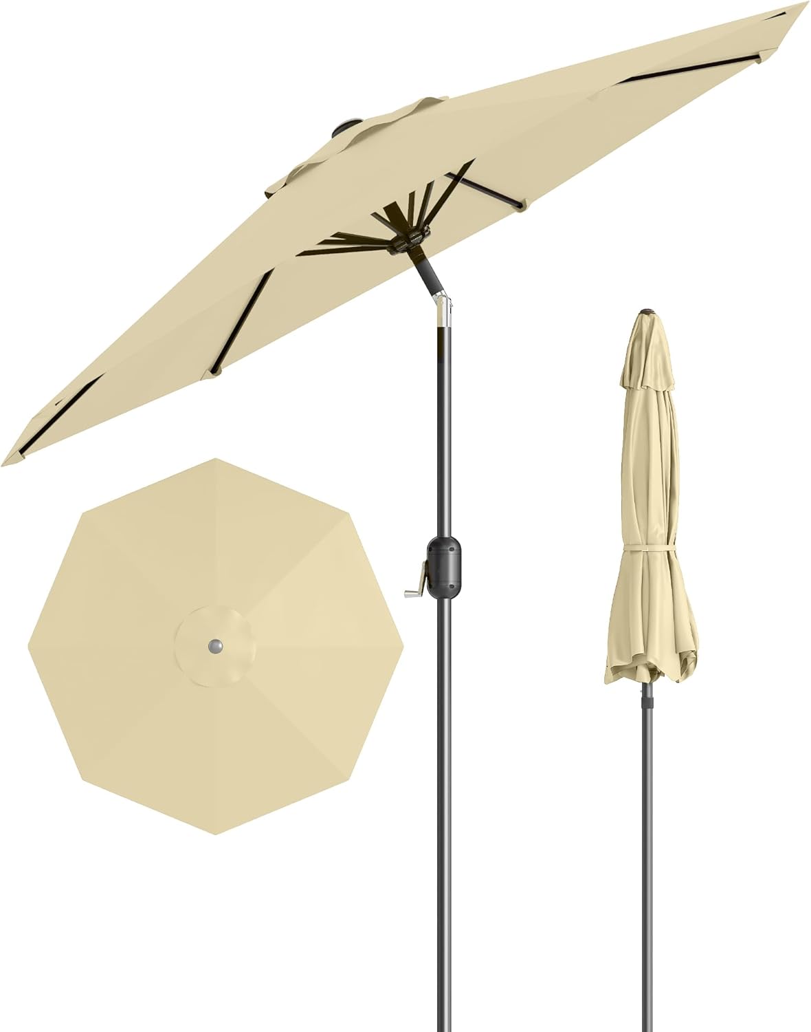 The 15ft double sided patio umbrella provides more shade than traditional umbrellas and is large enough to cover multiple recliners and large rectangular tables. Perfect for casual gatherings with family and friends.Package Includes:1 Sunshade Umbrella1 Sunshade baseYou don't need to buy extra base; we come with a bottom hold to install up to 138lbs of sand and other fillers. NOTE: Sand is not included, for the stability of the umbrella, please fill each sandbag with more than 50lbs of sand.PREMIUM CANOPY: Made of 220 grams of high-quality solution dyed fabric, UV protection coating provides 3 years fade resistance, 99.9% UV resistance and waterproof performance. Effectively blocks harmful UV rays including UVA and UVB to protect your health.SOLAR LIGHTING SYSTEM: Built-in 48 solar powered LED lights. Light up the night for your family, laugh and play under the warm umbrellas in the backyard, creating a harmonious and warm evening atmosphere for your family. When the battery is fully charged, the 4800mAh solar panel provides up to 10 hours of runtime.DURABLE STEEL ALLOY FRAME: 12 heavy-duty steel alloy ribs that are 20% thicker (12x18mm) work in conjunction with three vents at the top of the umbrella to circulate air and provide superior support EXCELLENT RUST RESISTANCE: Upgraded steel alloy umbrella pole and umbrella ribs are more rust resistant than traditional iron materials. Double-layer powder coated steel alloy surface with superb rustproof performance. Double protection to extend the life of the umbrella.EASY Crank: Smooth crank system ensures that opening (clockwise) and closing (counterclockwise) the patio umbrella can be easily done in seconds. The reinforced zinc alloy tilt mechanism is 1.5 times harder than aluminum alloy material, with 2 times higher tensile strength, which can double the service life.