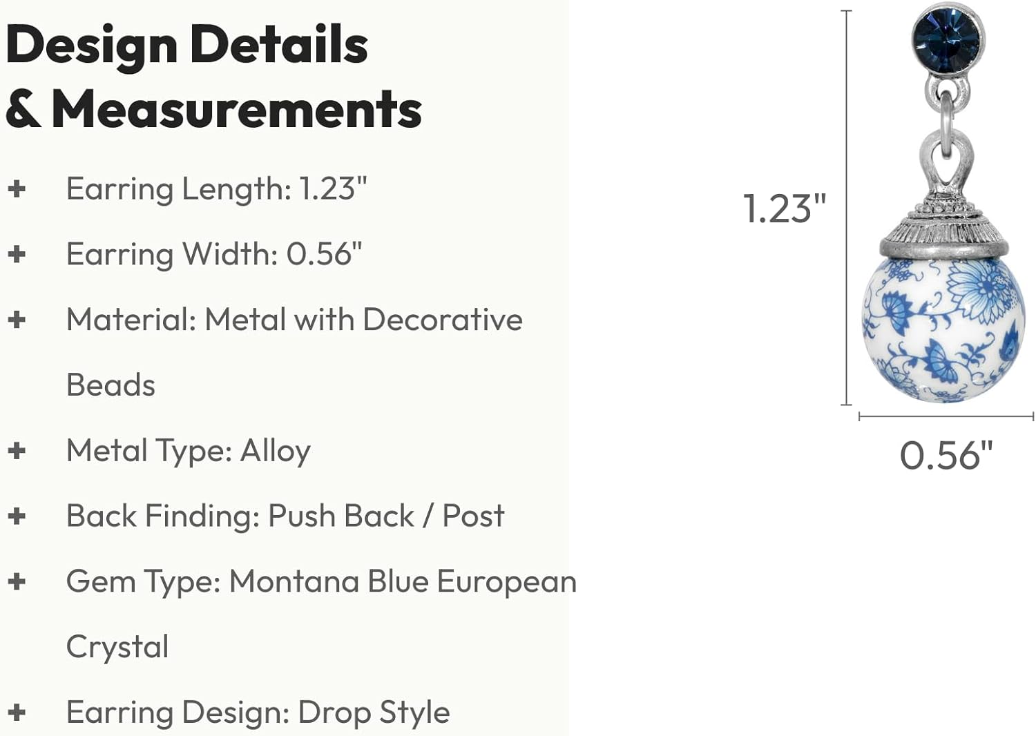 Sweet silver-tone earrings feature a lovely white bead with blue willow floral design. A beautiful blue crystal enhances the ultra femininity in these timeless, romantic drop earrings. Montana Blue European Crystal 14mm Round Blue Floral Decal Beads Measurements: 1.23"H x 0.56"W Post Back Earrings Made In USA BLUE WILLOW COLLECTION Our Blue Willow collection features motifs inspired by the iconic hand-painted ceramics by artisans in China made popular in the 17th and 18th century. These enthralling Blue Willow pieces make for a quintessentially classic 1928 Jewelry collection.