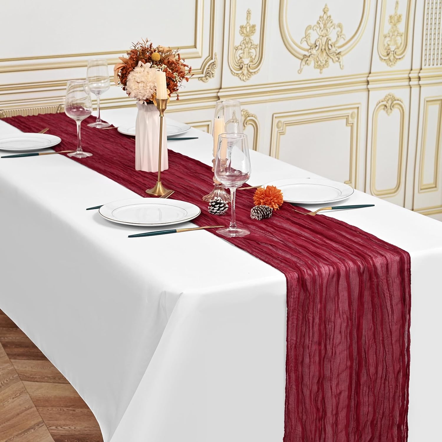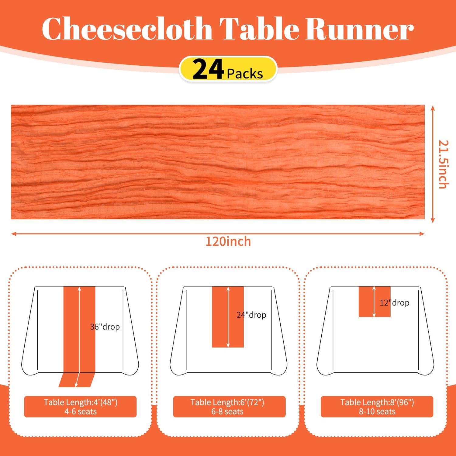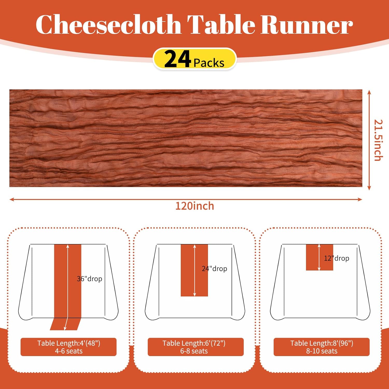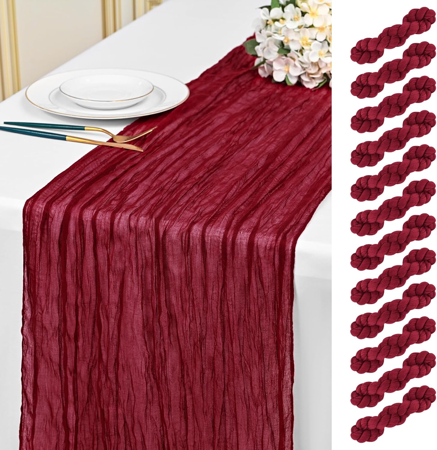 Specification:Quantity: 24 PiecePackage: One Pack of 24 Cheesecloth Table RunnerSize: 21.5x120 inch /50x300cmSize Fit:Please refer to the product image for the placement effect of different table sizesColor: BurgundyMaterial: 100% PolyesterStyle: Bohemian Romantic RusticFeature:1.Cheesecloth table runner has an elegant appearance with natural wrinkles. It presents a semi transparent visual effect, which is an excellent desktop decoration2.Cheesecloth fabric has many small mesh holes that make it breathable and easy to clean and care.3.The length of this product is long enough can support you to create more elegant shapes without constraints.Reminder:1.Do not over wash, dry clean, bleach, iron or expose to sunlight to maintain a better user experience and product durability.2.Due to differences in screen display, there may be slight differences in color.3.If you have any quality issues or misunderstandings with the products you receive, please feel free to contact us at any time to resolve them.