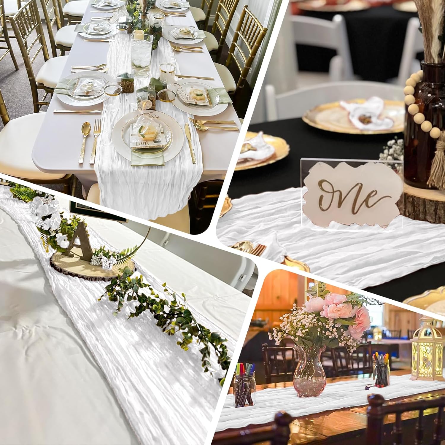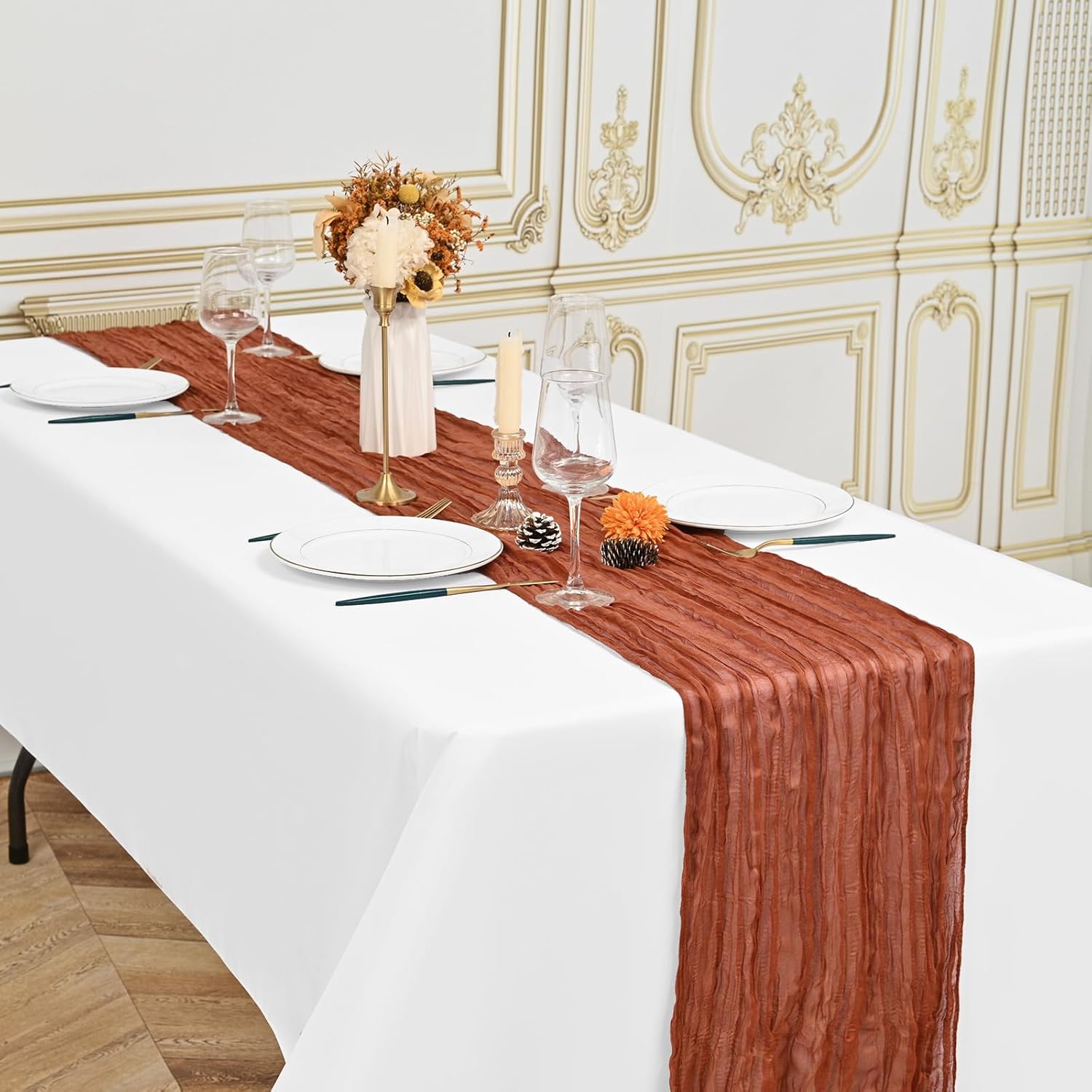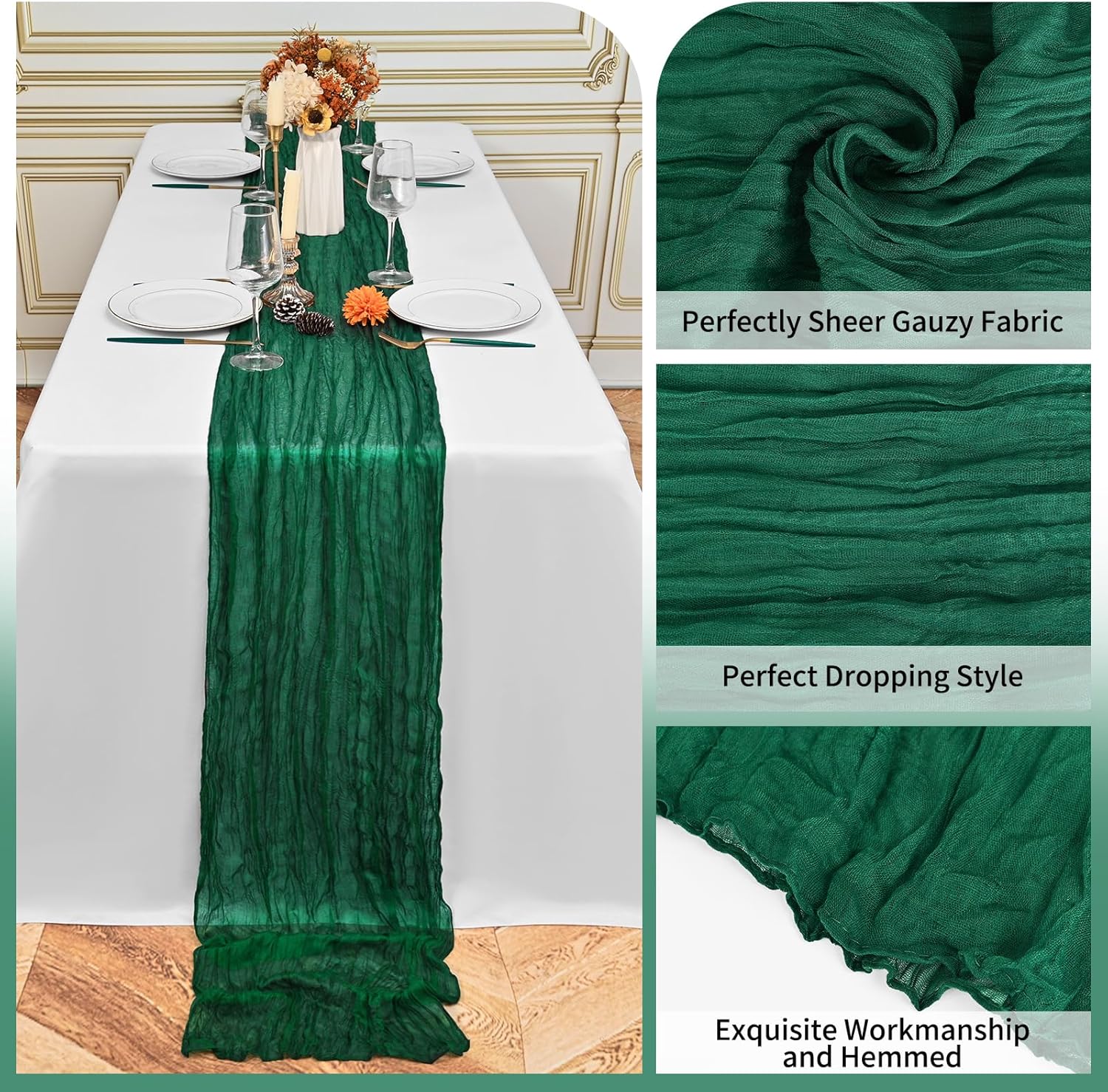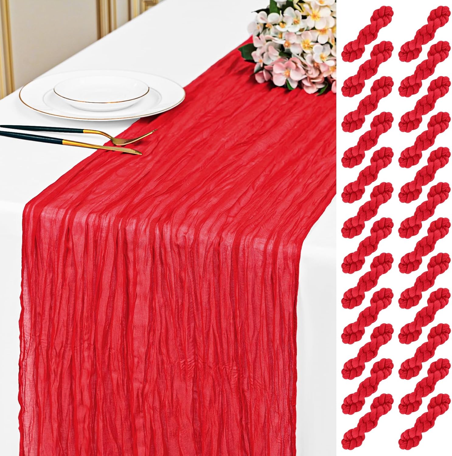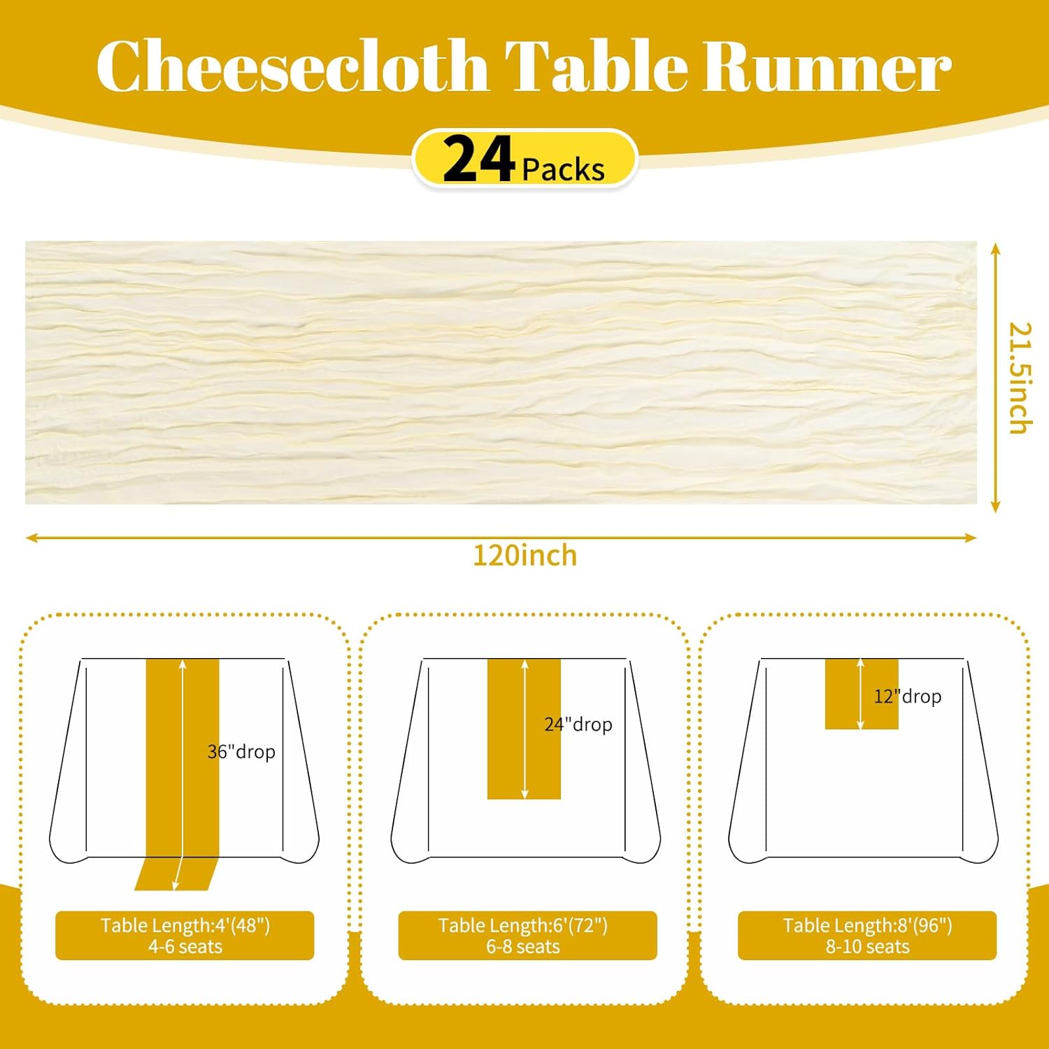 Specification:Quantity: 24 PiecePackage: One Pack of 24 Cheesecloth Table RunnerSize: 21.5x120 inch /50x300cmSize Fit:Please refer to the product image for the placement effect of different table sizesColor: BurgundyMaterial: 100% PolyesterStyle: Bohemian Romantic RusticFeature:1.Cheesecloth table runner has an elegant appearance with natural wrinkles. It presents a semi transparent visual effect, which is an excellent desktop decoration2.Cheesecloth fabric has many small mesh holes that make it breathable and easy to clean and care.3.The length of this product is long enough can support you to create more elegant shapes without constraints.Reminder:1.Do not over wash, dry clean, bleach, iron or expose to sunlight to maintain a better user experience and product durability.2.Due to differences in screen display, there may be slight differences in color.3.If you have any quality issues or misunderstandings with the products you receive, please feel free to contact us at any time to resolve them.