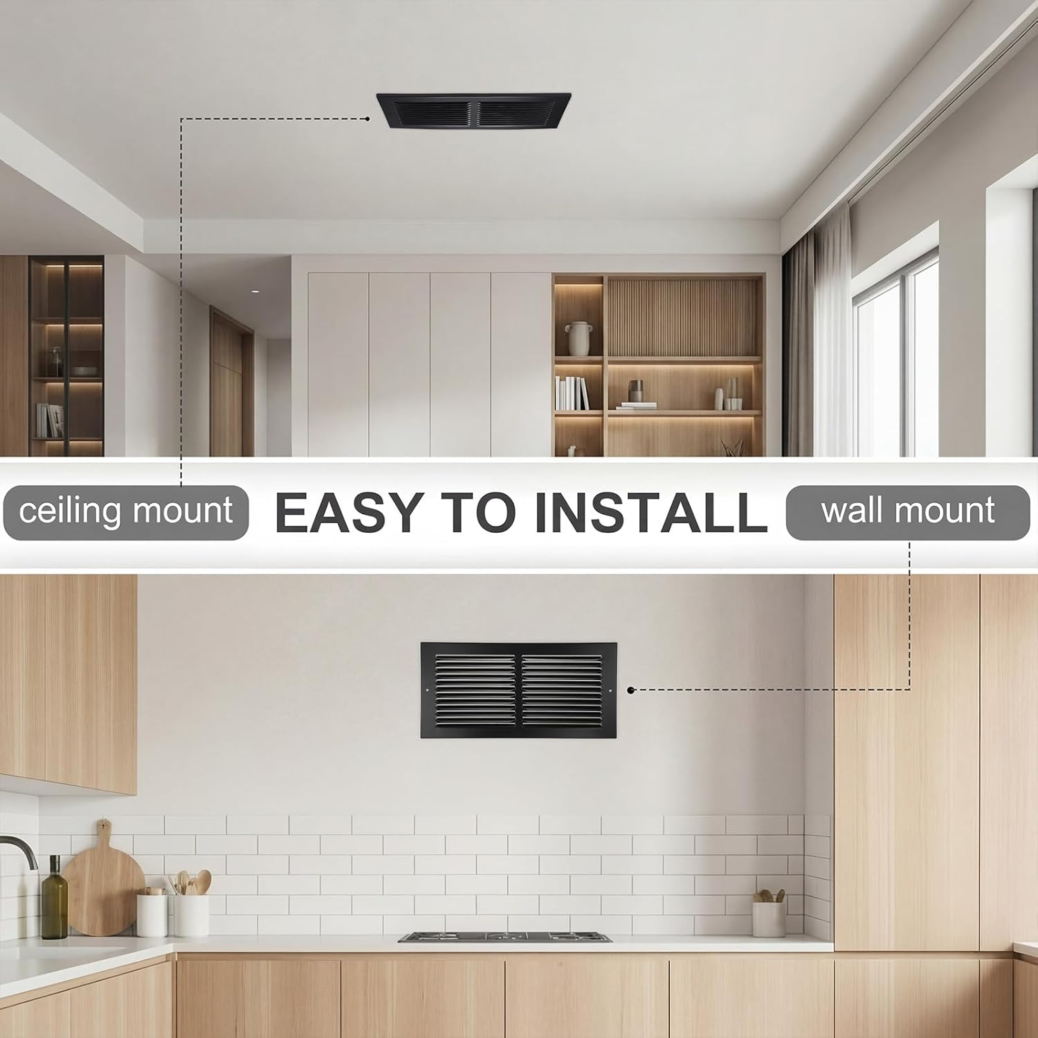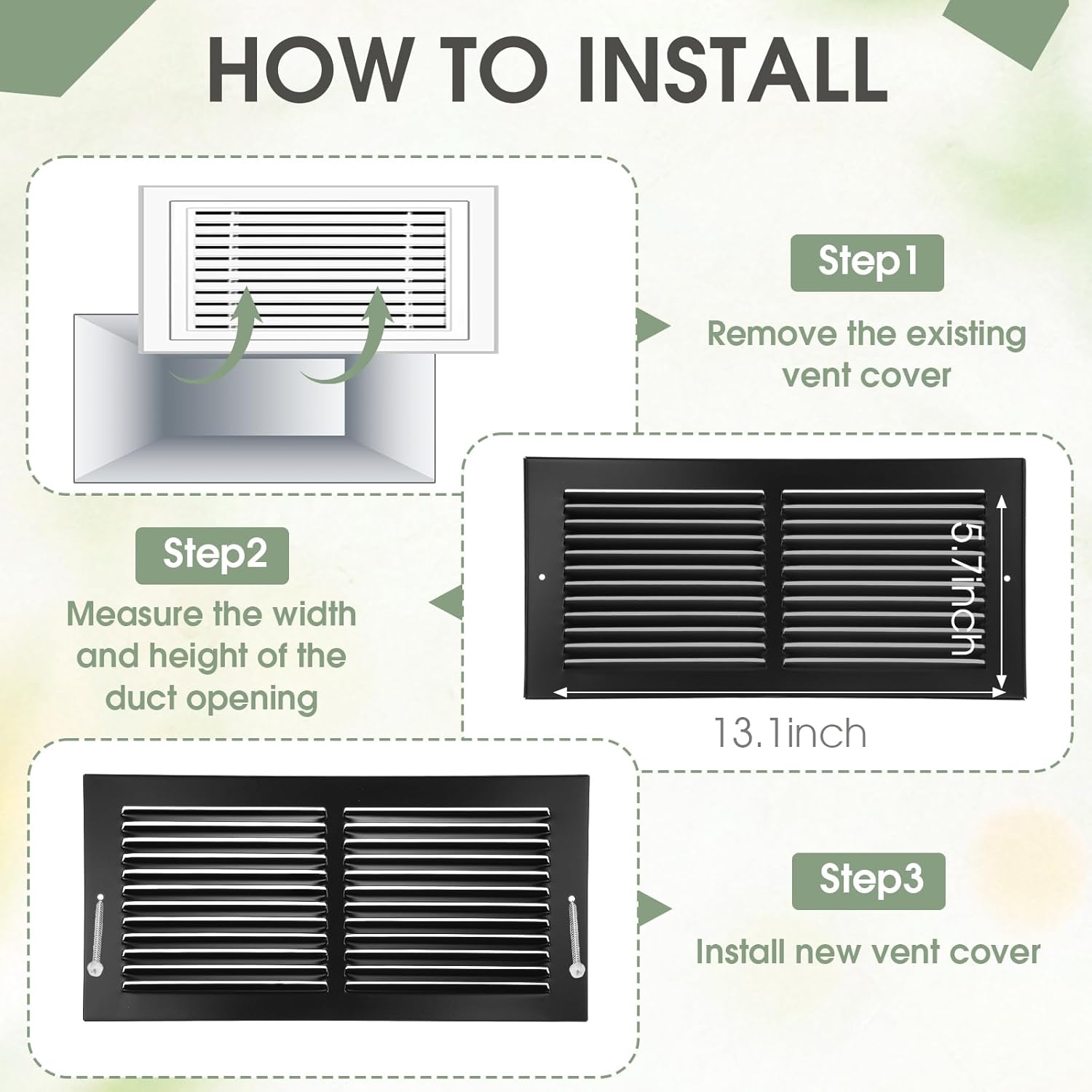 Features: Practical and Aesthetic: This return air vent cover not only improves air circulation efficiency and helps create a comfortable indoor environment, but also complements most home decoration styles. The beautiful appearance enhances the overall beauty of your space and blends harmoniously with the overall decoration style. Flexible and Reliable Design: These hvac vent covers provide airflow, and their flexible adjustment allows for easy, precise airflow control to your desired location. This helps you maintain a healthy living environment and offers optimal comfort and convenience. Specifications: Material: steel Color: black Size: 14 x 6 inches/ 35.56 x 15.24 cm Package includes: 3 x Ceiling Vent Covers Notes: Manual measurement, please allow slight errors on size. The color may exist a slight difference due to different screen displays