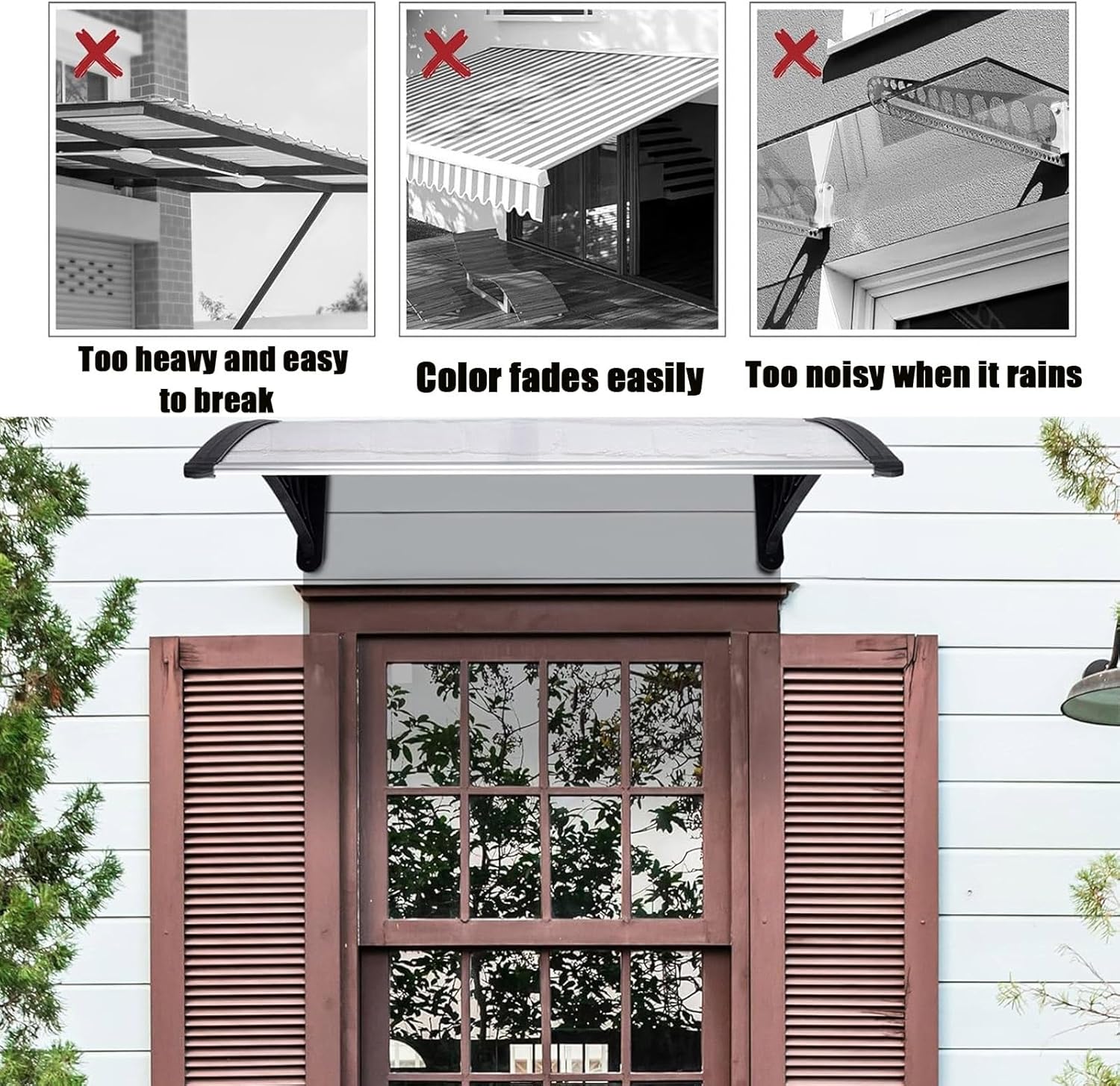 Transform your entryway with our stylish and functional awning, perfect for enhancing your home’s exterior. Designed for versatility, this window awning and door canopy is an ideal rain shelter that complements any architectural style with its sleek aluminum frame and transparent PC sun panels. Installation is straightforward, allowing you to quickly set up this outdoor front door patio awning and enjoy the benefits without hassle. Protect your family from harsh weather conditions, including intense sunlight, rain, and snow, while creating a welcoming outdoor space for relaxation or gatherings. Our awning effectively blocks harmful UV rays during summer months, ensuring a comfortable environment for you and your loved ones. It’s perfect for various applications, including doors, windows, patios, and balconies, offering year-round protection from the elements. Constructed with durable materials, including a sturdy PP bracket and lightweight aluminum alloy poles, this rain shelter is built to withstand the test of time. The sleek silver hollow board design not only enhances aesthetic appeal but also provides reliable coverage. Included in your package is one high-quality canopy that’s ready to enhance your outdoor experience. Please note that slight color variations might occur due to different lighting conditions, and manual measurements may vary by up to 1 meter. We are committed to ensuring your satisfaction, so if you have any questions or concerns, please feel free to reach out to us. Elevate your home’s entrance with our reliable awning and enjoy the perfect blend of style and functionality.