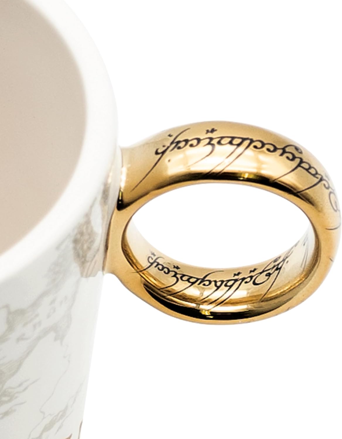 The Lord of the Rings mug with ring handle is the perfect choice for any fan of Middle-earth. With a filling volume of 460ml and made of robust dolomite, it is ideal for everyday use. The handle, in the shape of the iconic ring, gives the mug a unique, fateful design that recalls the epic journey of the nine companions. The detailed motif invites you to discover the map of Middle-earth while enjoying your favourite drink. To preserve the longevity of the mug, it should be kept away from microwaves and dishwashers. A stylish companion for those who want to start their day with a touch of fantasy.