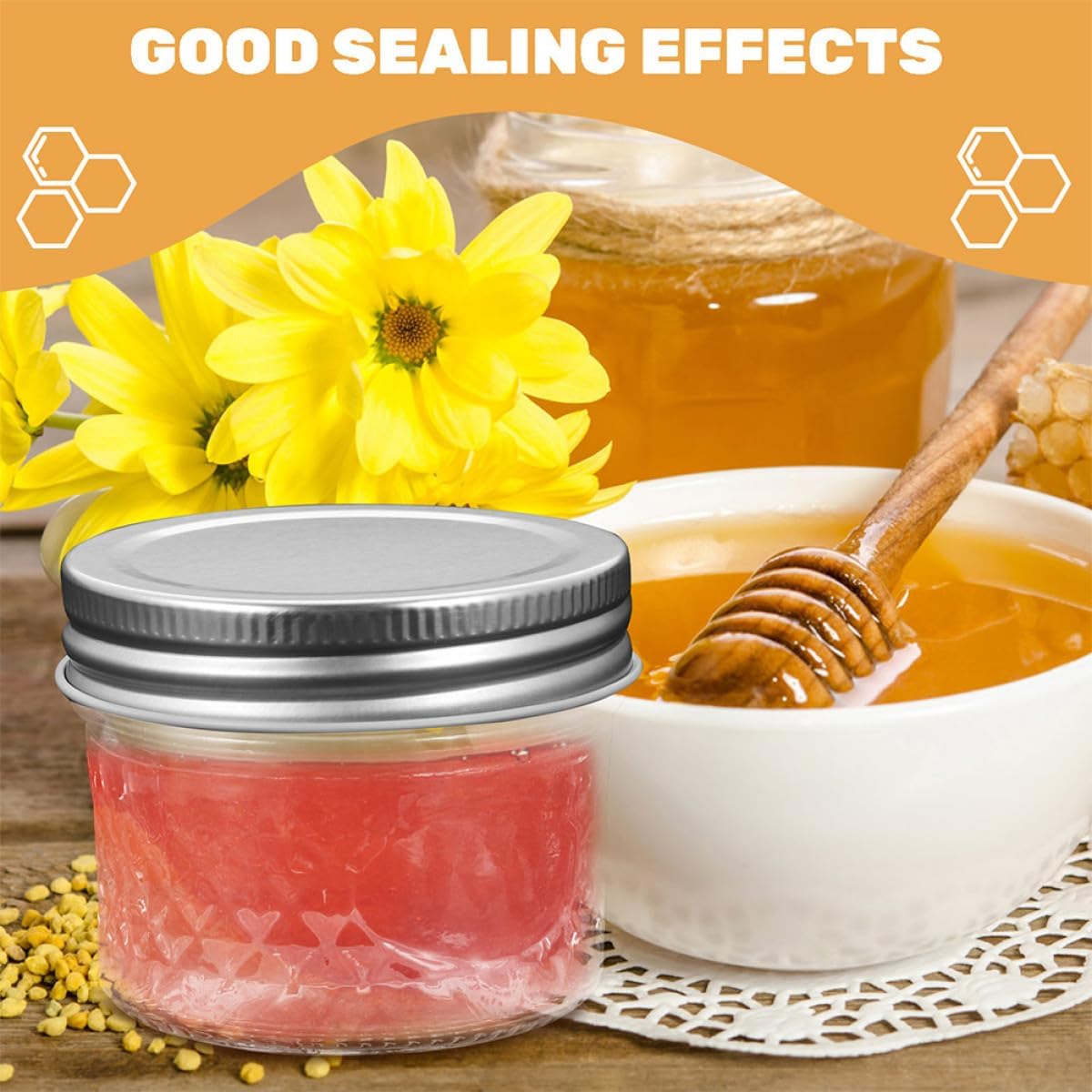 Package List 8 x jam jars 8 x lids Characteristics -Material:Glass, tinplate -Color:Transparent -Size:7.30X7.30X5.50cm/2.87X2.87X2.16in -Capacity: 120ml jelly jar -Product Info:Mason jar jar bottle - The Jam Jars are simple and practical in use, give you a pleasant using experience mini jam jars bulk. - Suitable for home kitchen, hotel, restaurant, bakery, cake shop, shopping mall, etc, which is very useful jam jar. - The wide mouth jars are easy to refill, take, and also convenient for you to wash, very practical to use canning jars. - The shape is delicate and simple, the color is clear, better effect to decorate your desktop. - Clear Jam Bottle has transparent design that allow you to create convenient on your desserts Jar With Lids.Goods Descriptionhoney mini jars Jam dispenser is perfect for daily food storage use in home kitchen, brings you more convenience.small jars Jam jar a clear glass jar with lid, honey jar is versatile and suitable for holding honey, syrup, jam and more