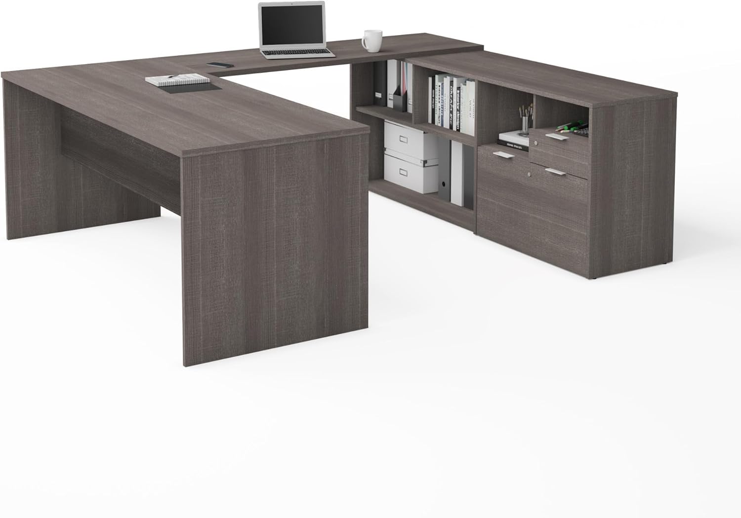 Atlin Designs has been created to adapt to your living space with the flexibility of its configuration possibilities. Its sleek design is Intelligent, Inspiring and Innovative.Features:- Material: Melamine and high density commercial grade particle board wood- Finish: Bark gray- Durable 1" commercial grade work surface with melamine finish that resists scratches, stains and wear- One utility drawer, one file drawer with letter, legal filing system and five open storage compartments- Drawers on ball-bearing slides for smooth and quiet operation- Drawers are lockable- Fully reversible unit- The hutch has one fix shelf covered by frosted glass doors- Meets or exceeds ANSI/BIFMA performance standardsSpecifications:- Product Dimensions: 29.6"H x 71.1"W x 88.6"D- Product Weight: 303 lbs