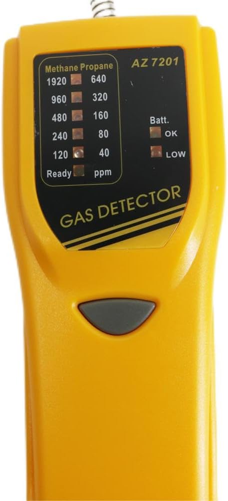 Application of 7201 AZ Handheld Digital Gas Leakage Detector:The portable 7201 AZ CH4 Gas Detector can measure the Natural Gas, Methane (CH4) and Propane (C3H8, liquefied petroleum gas, LP-gas or LPG), which had been widely used as part of a safety system.Model 7201Methane Range:120~1920 ppmMethane Sensitivity:1200 ppmPropane Range:40~640 ppmPropane Sensitivity:40 ppmGas Discrimination Filter:Built-inResponse Time:within 10 secondsWarm Up Time:within 60 secondsMeter Size:175(L) * 47(W) * 28(H )mmOperating Temperature:-5~45℃Operating RH%:5~95% RH (avoid condensation)Storage Temperature:-20~50℃Storage RH:%0~95% RH (avoid condensation)Power Supply:4 PCS AA Batteries or 9V AdaptorWeight:~120gFlexible Probe Length:18" (465 mm)Standard Package:Meter, Manual, carry case