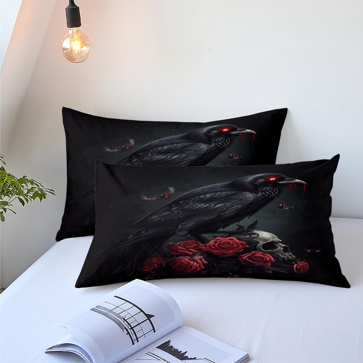 【Great Choice and Blessings】: We offer you a wide selection of colors and styles, unique pattern design is suitable for various indoor decoration. The gothic skull crow bedding set also is a great gift for mums, dads, sisters, brothers, grandmothers, wives, husbands, daughters, sons and all other beloved ones. 【Size and Package Include】: Twin size: 1 twin comforter ("68 x 90") + 1 pillowcase ("20 x 30"). Full size: 1 full comforter ("80 x 90") + 2 pillowcases ("20 x 30"). Queen size: 1 queen comforter ("90 x 90") + 2 pillowcases ("20 x 30"). King Size:1 King comforter ("104 x 90") + 2 pillowcases ("20 x 36"). 【Ultra Soft Fabric】: This down alternative comforter set is crafted from 250 grams brushed microfiber, which is very fluffy,soft,lightweight and breathable, ensure you a cozy sleep throughout the night. And This soft gothic skull crow comforter is suitable for all seasons, warm in winter and cool in summer, giving you 365 days of high quality sleep. 【Unique Design】: This gothic skull crow bed set is crafted the unique tight stitching process, which prevents fill from clumping or shifting. And it adopts the new 3d printing technology, the pattern is clear and does not fade. Warm Tips: The gothic skull crow comforter and pillow shams are printed on the front side only, the back of them are white colored. This lightweight comforter is medium thick and not suitable for too cold areas. 【Cleaning Method】: Machine Washable. Gentle cycle with cold water. Do not bleach. Ironing at low temperature. 【Guarantees & Service】: If you encounter any problems, please do not hesitate to contact us, we will process your request as soon as possible within 24 hours.
