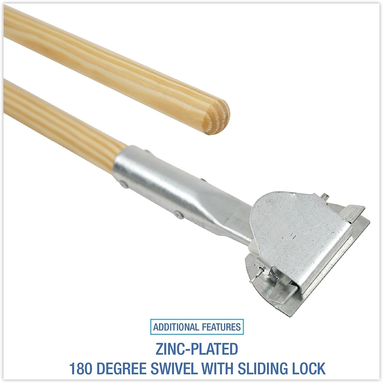 Snaps onto Boardwalk Clip-On Dust Mop Frame (sold separately) from standing position. 12-gauge zinc-plated steel hardware. 180 swivel head with sliding nylon lock. Double-lacquered wood handle.