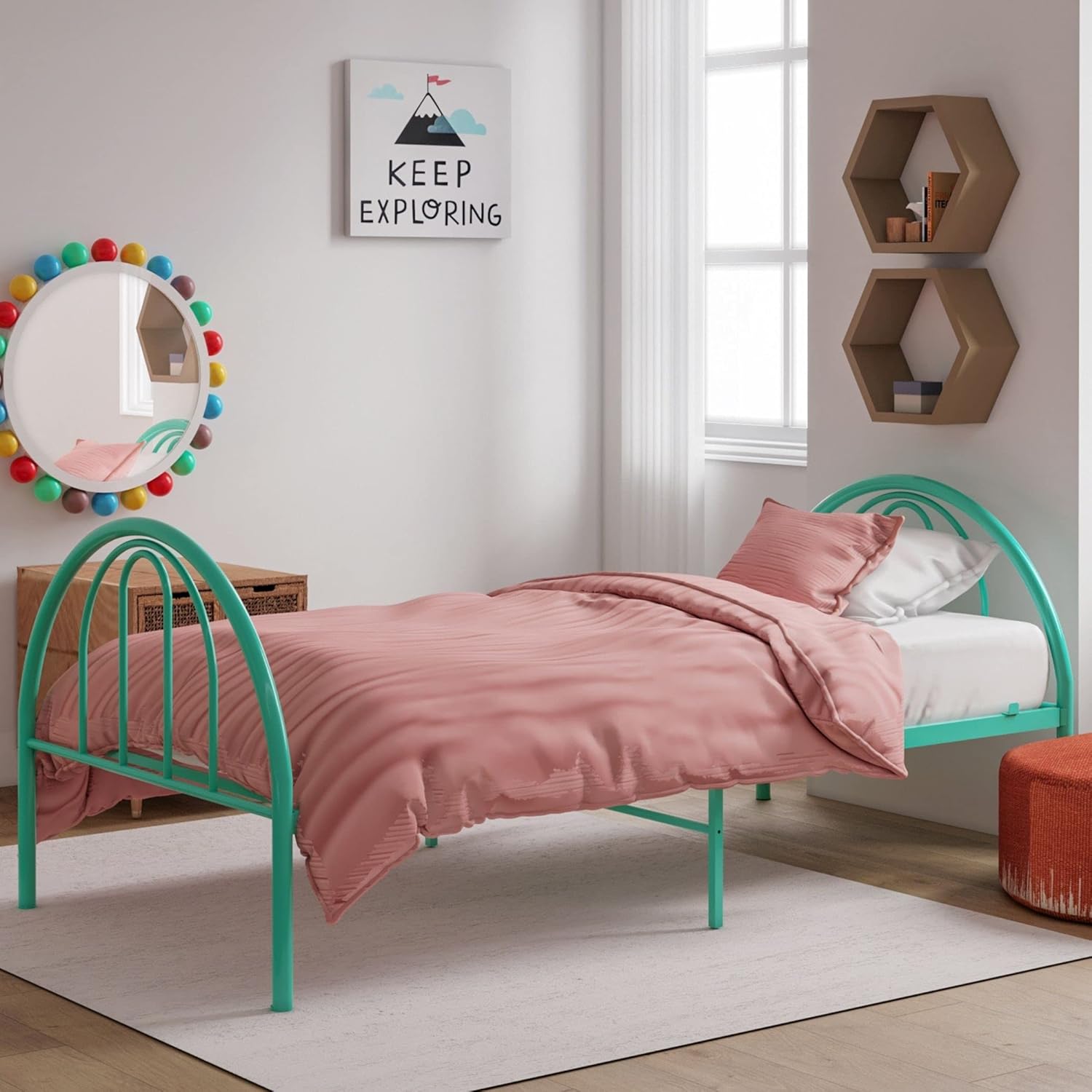 The Brooklyn twin bed frame is a stylish transitional bed for your growing child's growing independence. Featuring a unique curved design, this solid steel kid's bed frame is ready for years of use, with six points of contact delivering reliable support and a comfortable night's sleep. Our versatile twin bed for children has gorgeous rounded edges that seamlessly blend into your home decor, whether in a kid's bedroom or used in a guest room. In addition to meeting all government safety standards, our products feature solid construction, non-toxic finishes that wipe clean easily, and design details that provide lasting durability and reliable support for active kids - because jumping on the bed is inevitable. We go the extra step with Greenguard Gold Certification, contributing to cleaner indoor air and a healthier environment for you and your family. Please note that assembly is required using the included tools and hardware. Bed does not need a box spring or bunkie board, fits a standard twin size mattress (not included), and supports up to 300 lbs. Assembled dimensions: 79.53” (L) x 39.49” (W) x 32.09“ (H); 1-year manufacturer's warranty.