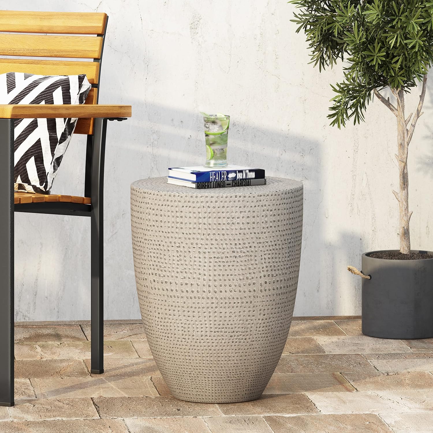 Restore your outdoor space with refined aesthetics by bringing home the perfect accessory for your decor. With a smooth lightweight concrete structure and modern touch, our side table offers high durability and stunning looks for your backyard or patio. Perfect as an end table next to your chat set or sectional, this piece will hold any snacks or chilled drinks in sophisticated grace. Finished with a rounded tapered cylindrical shape and hammered texture, this table is a seamless addition to any space.Material: Lightweight ConcreteFinish: Concrete FinishNo Assembly RequiredDimensions: 14.25 inches deep x 14.25 inches wide x 17.50 inches highWeight Capacity: 15 lbs