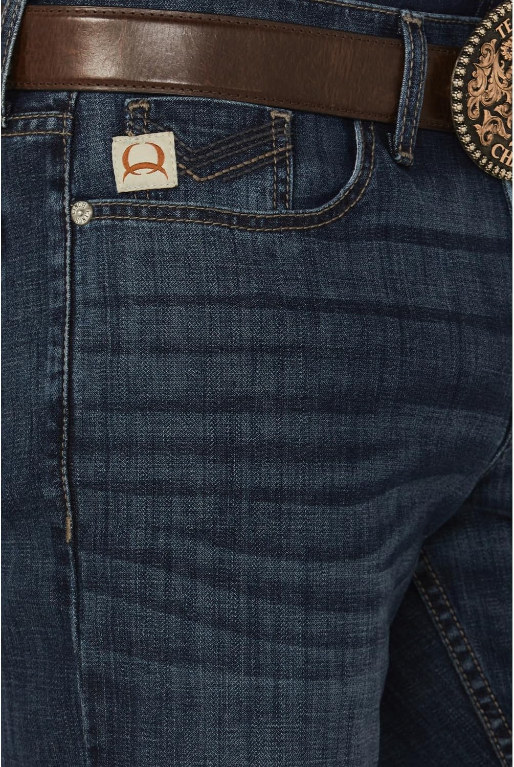 Cinch Dark Stonewash Tint Hand Sanding Whiskers Chevrons Knee Starburst Tacking 10.9 oz. performance stretch denim MB30037001A superb reissue of a longtime relaxed favorite. GRANT combines an ultra-cool rinse with heavy finishing details, 1/2" yoke and pocket stitching, and a moody trio of slate blue, nickel and taupe back pocket embroidery.