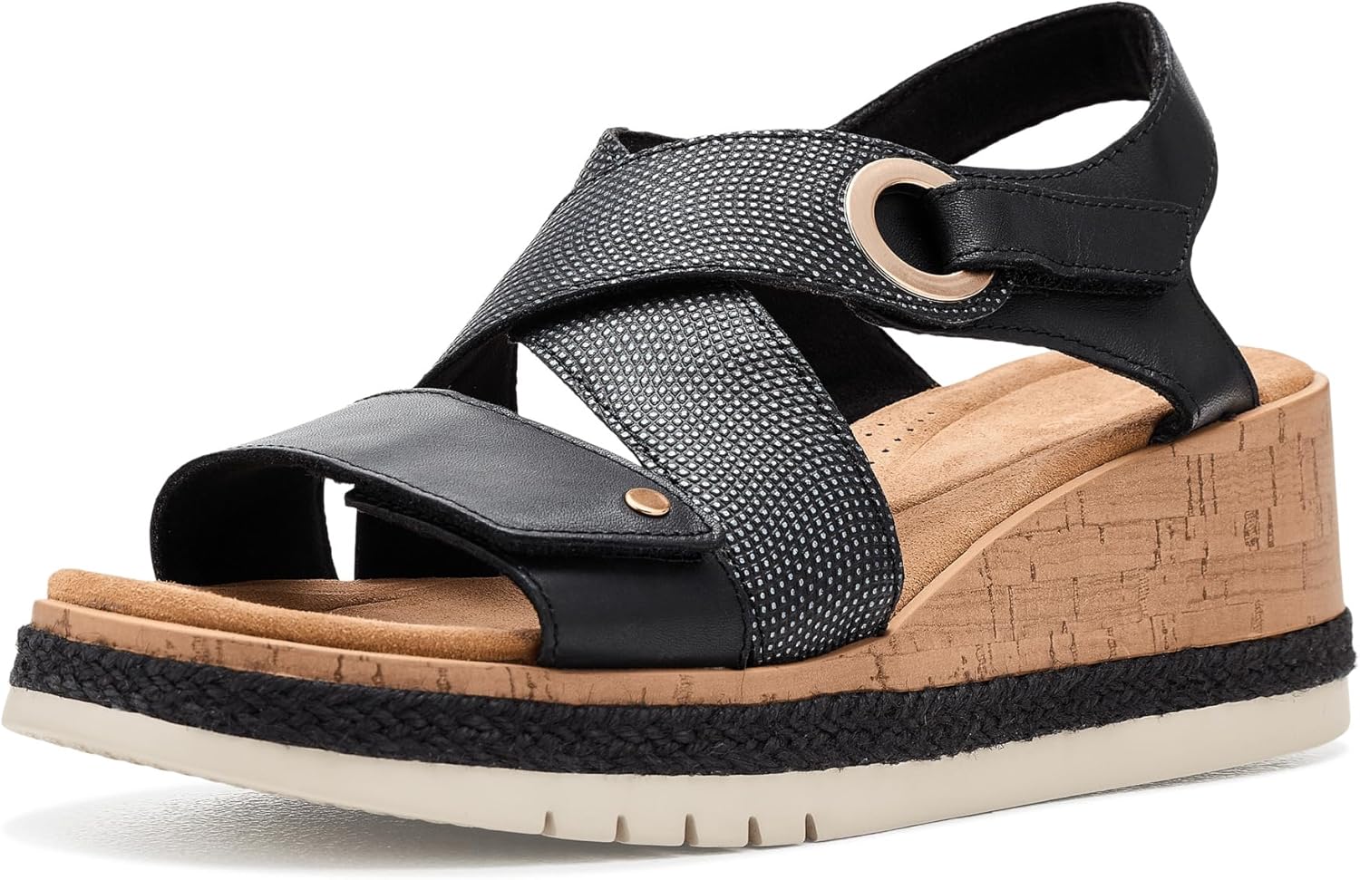 Prepped for casual, modern styling, Clarks Kidiki Sun sandal calls on an easy-walk wedge heel to keep movement feeling comfortable. Prioritising underfoot support and a lightweight feel, this summer silhouette delivers modern, crafted styling for easy, all-day wear. Leathers lend a premium finish, while an EVA outsole and a two layer midsole offer lasting durability. - Premium black combi leather upper - Moulded Contour Cushion footbed supports every step - Adjustable straps add comfort and security for all-day wear - Hook-and-loop closure provides easy adjustability - Textile lining - Two-layer midsole promotes bounce and flexibility - Lightweight, impact-absorbing EVA outsole - Wedge heel with jute finish lends a crafted look - Heel height: 65mm
