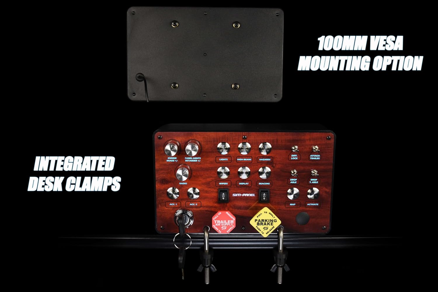 Introducing the ATS/ETS Classic II Button Box – the thrilling next-level evolution of the legendary ATS/ETS Classic Button Box from Sim-Panel! Packed with upgrades, the Classic II is set to revolutionize your gaming setup. Featuring versatile mounting options—including 100mm VESA mounting compliant inserts and integrated desk clamps—your setup stays rock-solid, no matter how intense the journey gets. Light up your rig with vibrant, upgraded backlighting that casts a stunning glow across your controls—perfect for immersive, late-night hauls. Every detail has been fine-tuned for realism and performance, from the premium brushed stainless steel buttons to the true-to-life ignition switch and brake knobs that put you right in the cab. Offered in three striking styles, the refreshed base design brings a sleek, modern edge to your setup. And for those who crave a custom touch, choose from two premium finishes: Black Brushed Aluminum for bold industrial style, or Woodgrain for timeless, classic appeal. Whether you're upgrading from the original Classic or shifting into the Sim-Panel world for the first time, the ATS/ETS Classic II delivers the perfect fusion of style, realism, and craftsmanship—taking your trucking setup to a whole new level.