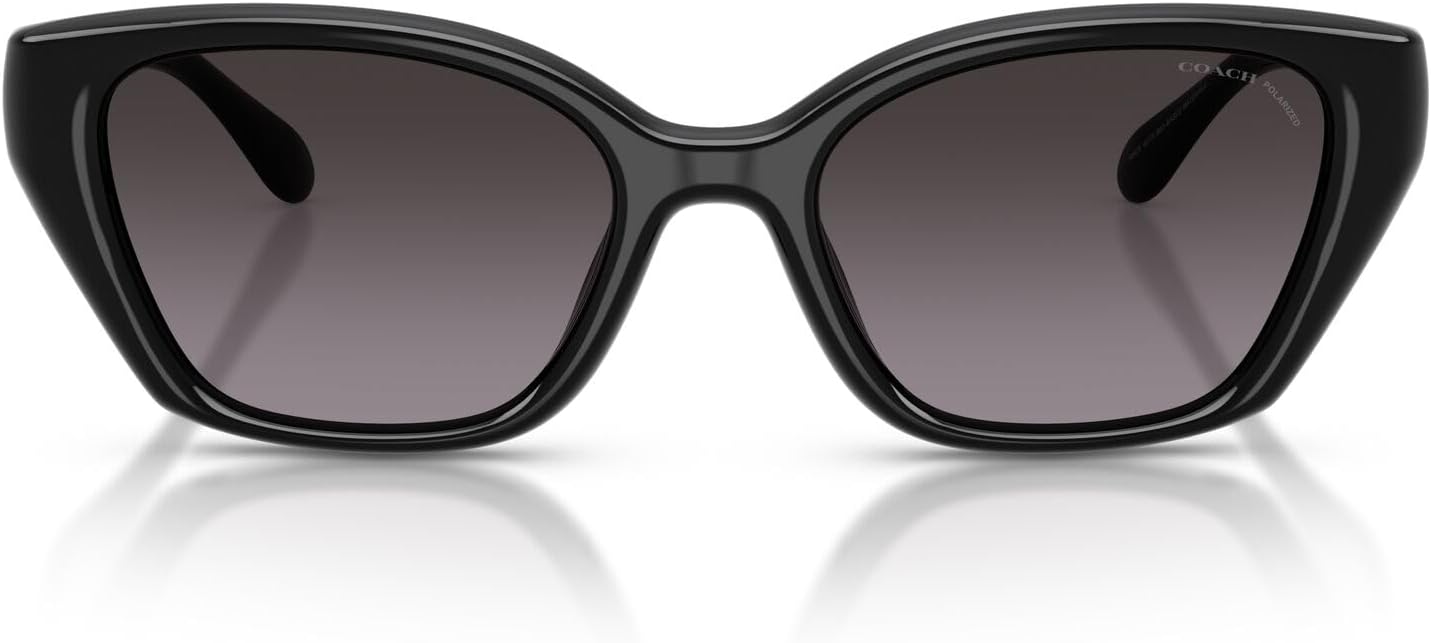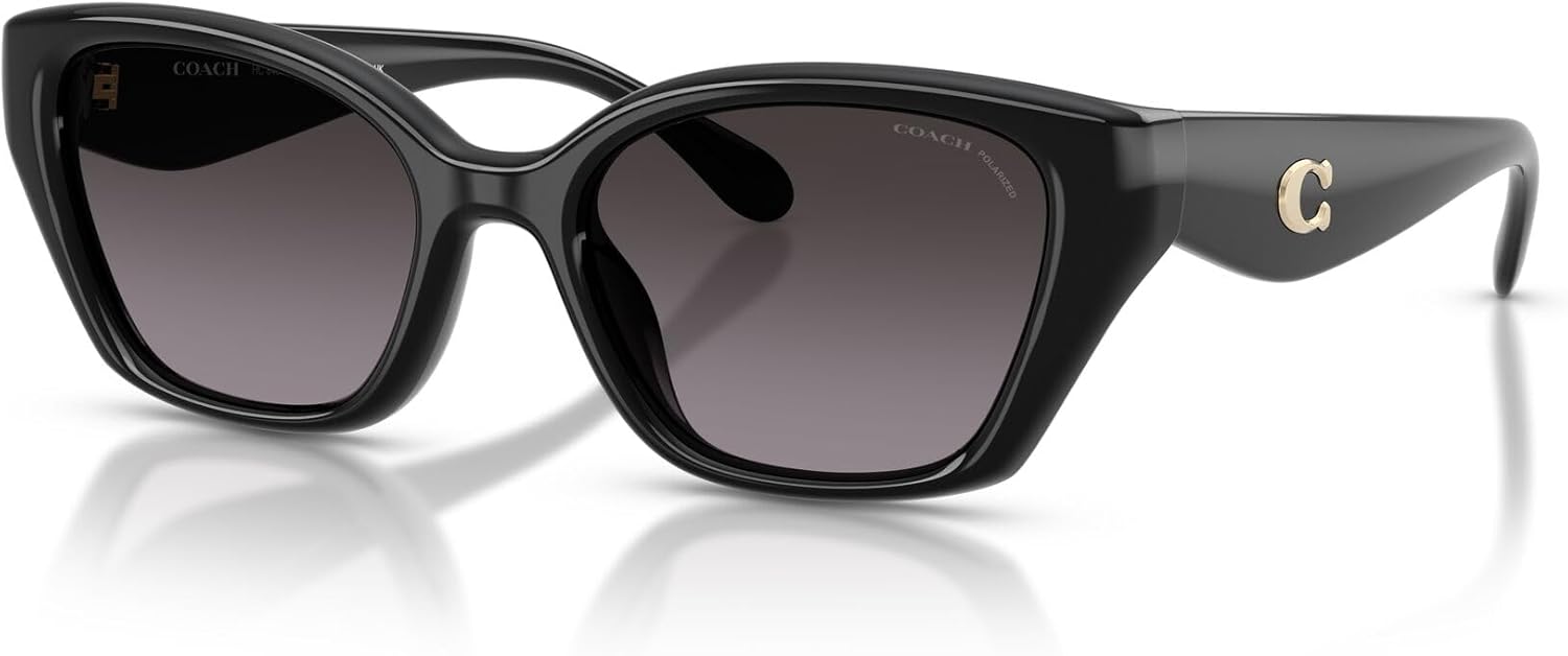 The Coach HC8434U Universal Fit sunglasses feature a distinctive cat eye silhouette from Coach's Sculpted C Hardware collection. This sophisticated design showcases sculpted C hardware detailing with universal fit technology that provides enhanced comfort through a narrower bridge and longer, more curved nose pads that increase grip while reducing the space between the frame and cheekbones. Available in versatile frame and lens combinations including black with grey solid lenses, black with grey gradient polarized lenses, milky putty with brown peach gradient lenses, milky cherry with berry mirrored lenses, metallic pearl with metallic mirrored lenses, and industrial grey with grey solid lenses that offer both classic and contemporary styling options. The cat eye shape provides flattering proportions while the universal fit construction ensures exceptional comfort and all-day wearability for all facial structures. Perfect for the modern woman who appreciates timeless cat eye design with inclusive fit technology, these sunglasses transition effortlessly from professional settings to social adventures. All lenses offer complete UV protection to shield your eyes from harmful rays during outdoor activities and daily wear. Each pair comes with a protective case and cleaning cloth to preserve your frames and maintain their pristine appearance. Coach sunglasses sold by authorized sellers, like Amazon.com, are eligible for all manufacturer warranties and guarantees. Click on the Coach link above the product title to shop the entire Coach sunglass and eyeglass assortment.