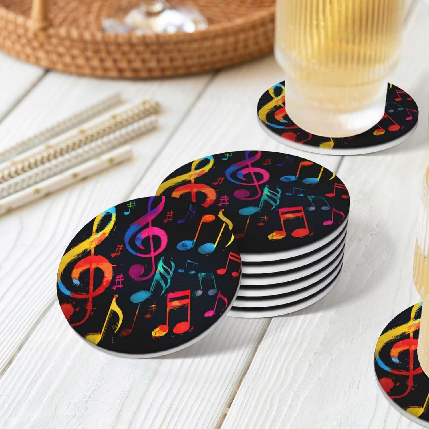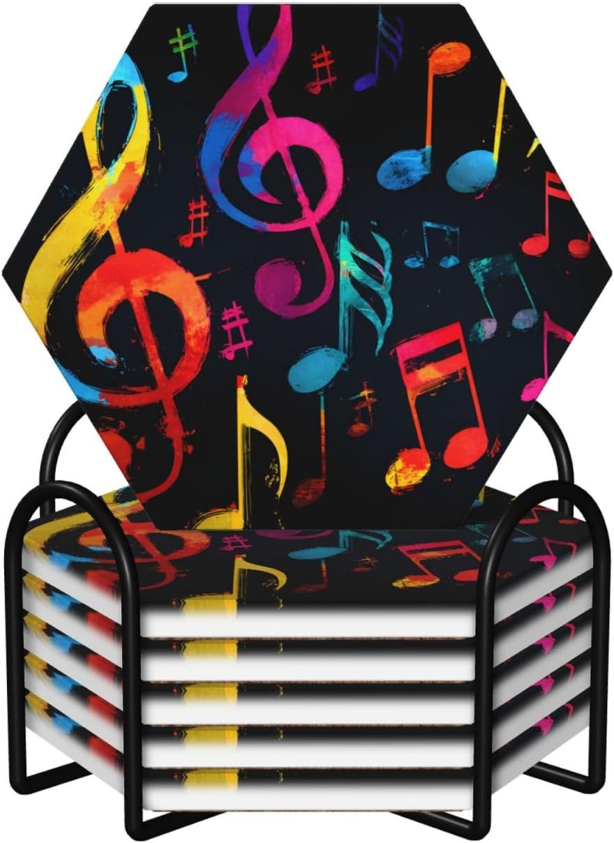 Product Name: DCEHGEW Ceramic Drink CoastersMaterial Type: Ceramic with cork bottomSize: Round: 4.1 x 4.1 inches, Square: 3.9 x 3.9 inches, Hexagon: 4.3 x 3.7 inchesPattern: Colorful Music Notes About Our Ceramic Absorbent Coasters:Product Features - Crafted from high-quality ceramic, these coasters are odorless and eco-friendly. Their superior absorbency keeps your surfaces dry by quickly soaking up spills from coffee, cola, and other beverages within 10-15 seconds.Applicable Scenarios - Perfect for adding a stylish touch to your kitchen, living room, bar, hotel, or restaurant. These coasters are an ideal present for birthdays, Mother's Day, Father's Day, Valentine's Day, anniversaries, housewarming celebrations, or Christmas.Accessory Structure - Each set includes 6 ceramic coasters with cork bottoms, accompanied by a sleek black metal stand for organized and aesthetic storage. Choose from three different shapes to suit your style and needs.Washing Instructions - Easily clean these coasters with water or a damp cloth.Special NoteDue to different measurement methods, a deviation of up to 0.3 cm in size is considered normal.Please Note:The product images are for reference only. Actual products may vary slightly due to production factors such as batch differences and machine settings. Minor variations in color, position, and size are normal and not considered defects. Thank you for your understanding!Customer Service:We want to make sure you have an amazing experience with us. Please contact us with any feedback you may have. We love to hear from you and usually respond within 12-24 hours.