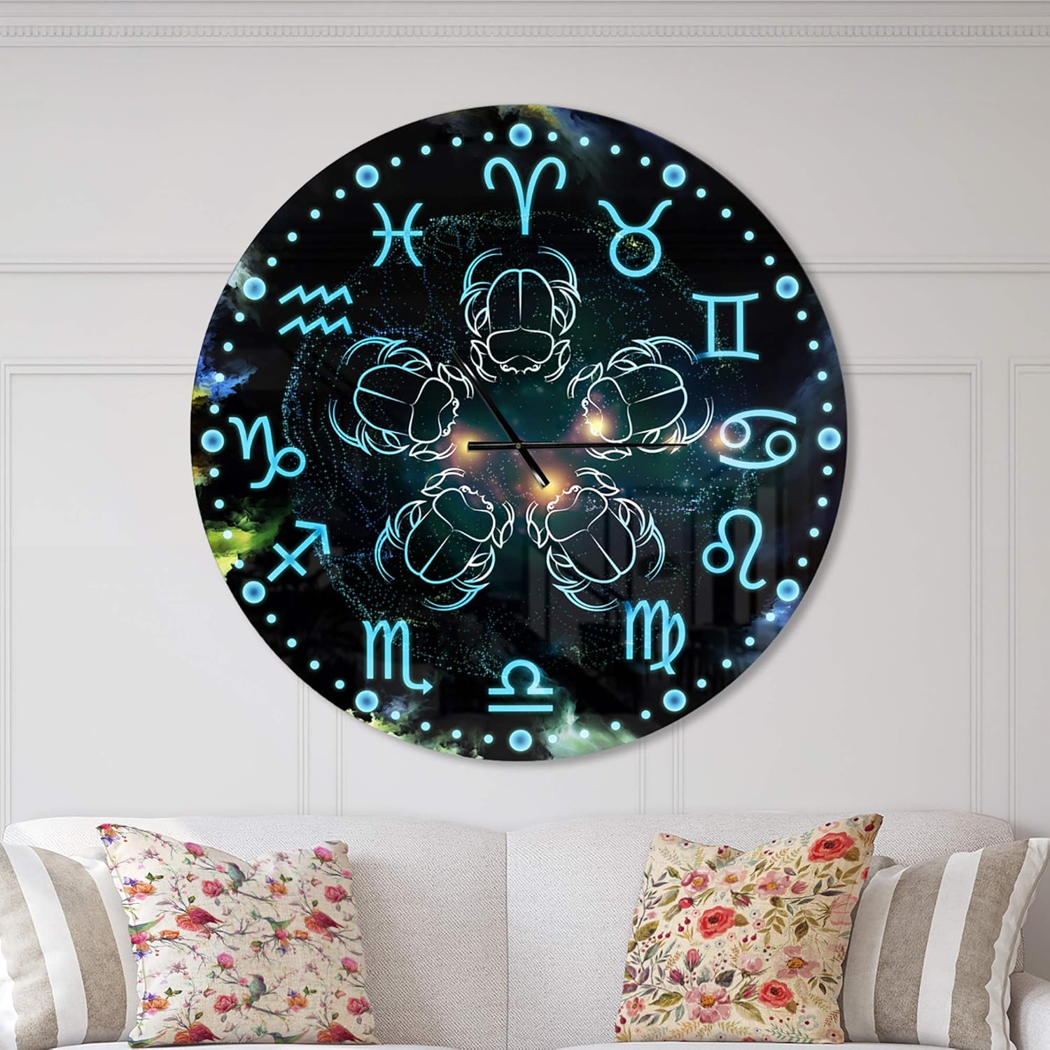 An exquisite design bringing beauty to your home and office, this Black Modern & Contemporary circle wall clock is printed on one-hundred percent firm aluminium. The smooth surface is glossy and very reflective, giving this round clock an elegant and contemporary style. For your convenience, this Astrology with scarabs Clock arrives with an AA battery included and is ready to be installed on your wall right away. This Cottage/Country Oversized round clock is available in various sizes, and guarantees to be the center of attention of your space. Features - 1 mm aluminium grade sheet metal - Available in circle 23x23 29x29 36x36 - High Quality Gloss Coating provides deeply vibrant colors - The mounting frame creates a floating artwork illusion - All mounting brackets and hanging instructions are included - Use a microfiber cloth for easy cleaning - AA battery standard included with every order - Effortless to install and hang