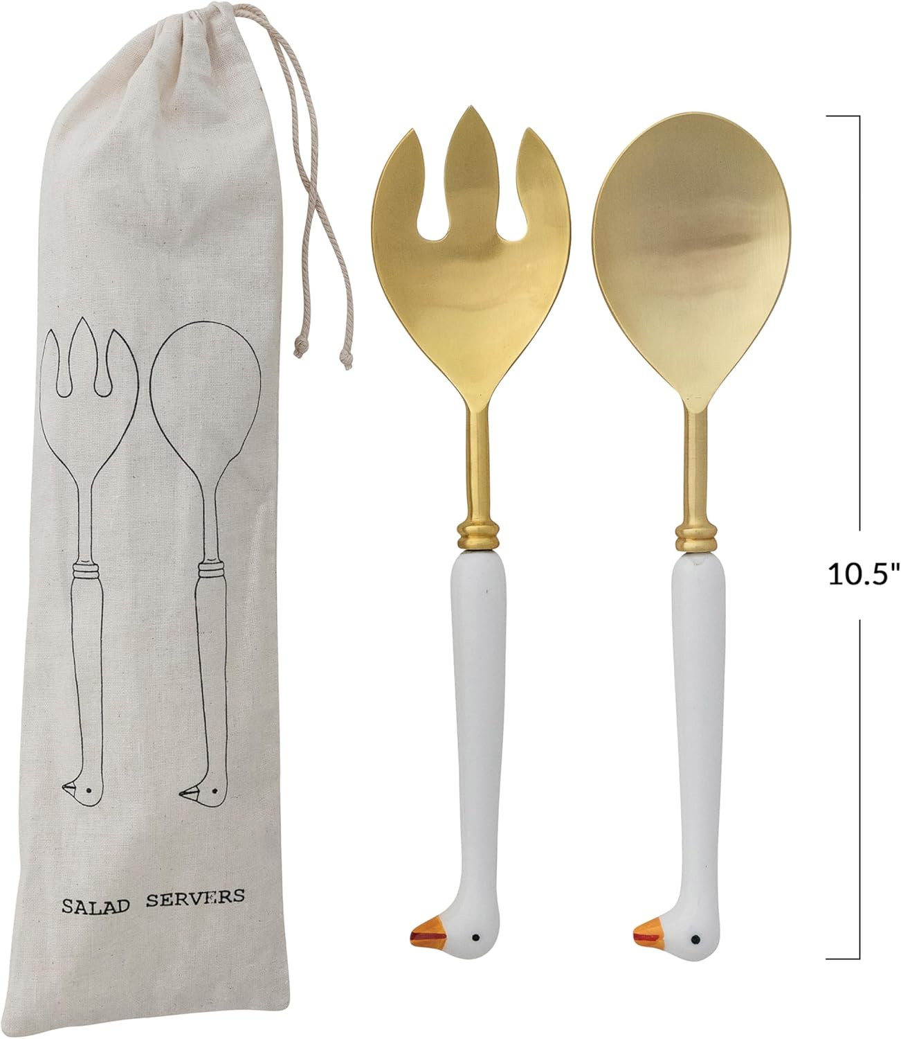 Add the Stainless Steel Spoon and Fork Salad Servers with Aluminum Goose-Shaped Handles in Printed Drawstring Bag, Cottagecore Farmhouse Serveware to gatherings that celebrate character, craftsmanship, and joyful design. This charming serving set features a spoon and fork crafted from stainless steel, each topped with a sculptural aluminum goose handle in warm gold, white, and orange hues. Perfect for Contemporary, Casual, Cabin, Farmhouse, and Cottagecore settings, the set arrives in a printed drawstring bag for easy gifting or storage. Made of stainless steel and aluminum, each piece measures 10.5 inches long and showcases hand-finished details that make every set unique. Elevate hosting rituals with serveware that blends playful elegance and artisan appeal.