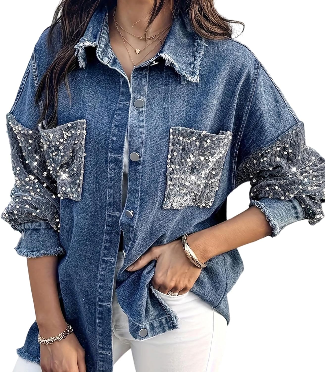 " Make a bold style statement with our Denim Jacket for Women Plus Size—a stunning blend of glamour, comfort, and inclusivity. Tailored for plus-size women,plus size jean jackets for curvy women is available in sizes XL to 4XL, featuring an oversized silhouette that flatters curvy figures while offering a relaxed, on-trend fit. The star of the show? Exquisite bling embroidered pearls and beading that transform classic denim into a head-turning piece of wearable art. light weight plus size jean jackets for women base exudes vintage charm, softened by a gentle fade that adds depth and character. Overlaying timeless canvas are intricate pearl and bead embellishments, strategically placed to catch the light and create subtle shimmer. Functionality meets fashion in the oversized design, which allows effortless layering over plus-size tees, sweaters, or dresses.The classic trucker-style button-front closure and stand collar nod to timeless denim aesthetics, updated with glamorous accents that make this jacket a versatile standout. Crafted from high-quality, breathable denim, plus size denim jackets for women classic button down jean jacket prioritizes durability without compromising comfort. The pearls and beads are securely stitched to withstand regular wear and washing, maintaining their sparkle through every adventure. Styling possibilities are endless: pair with plus-size skinny jeans and sneakers for a casual, glammed-up daytime look, or layer over a plus-size slip dress and heels for a night out. The oversized silhouette adds effortless cool, while the bling details elevate any outfit from ordinary to extraordinary. Ideal for festivals, dinners, or everyday wear, this jacket is a must-have for plus-size women who refuse to compromise on style or comfort. Easy to care for, simply machine wash cold and tumble dry low to preserve the denim’s softness and the embellishments’ integrity."