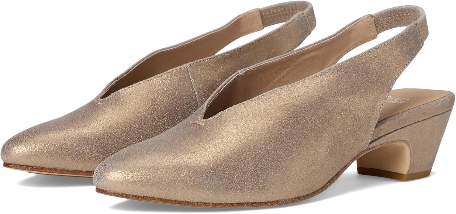 A soft pointed toe slingback with a low comma heel, leather with rubber plug bottom for comfort and wear.