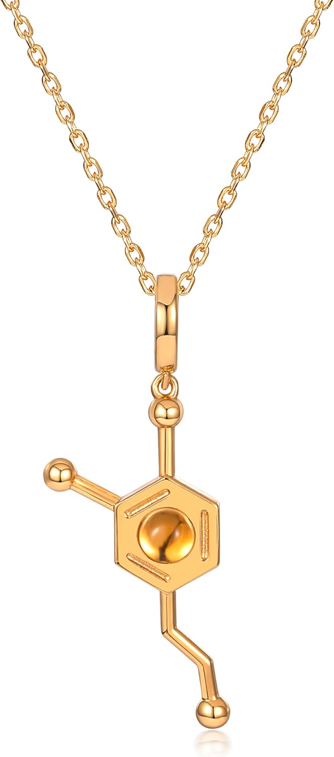 This stunning necklace is not just a piece of jewelry but a statement of elegance and sophistication. It features a unique pendant crafted into the intricate molecular structure of Dopamine - a symbol of pleasure, joy, and motivation. The pendant is made from high-quality sterling silver, and plated with real gold to add an extra touch of luxury. At the heart of this beautiful design sits a premium natural Citrine gemstone, known for its vibrant yellow hue and renowned for its properties of prosperity and success. This necklace is perfect for anyone who appreciates the fusion of science and beauty in a wearable form. Its elegance makes it versatile for any occasion, be it a casual outing or a formal event. Treat yourself or a loved one to this captivating piece of jewelry that is as unique as it is beautiful.