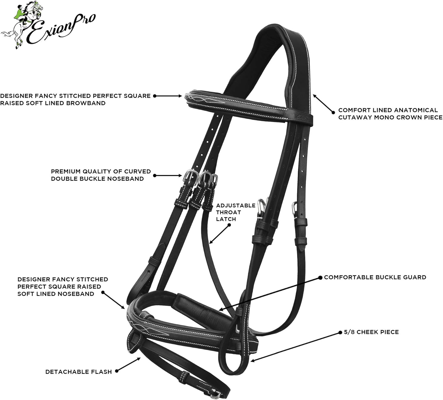 The Exion English Jumping Hunter Bridle with Removable Flash & Rubber Reins is designed for the performance rider who demands comfort, versatility, and quality. Ideal for hunter, jumper, and eventing disciplines, this bridle blends practical design with anatomical benefits for your horse.Crafted from premium vegetable-tanned drum-dyed leather, this bridle offers long-lasting strength with a polished, professional appearance. Its anatomically shaped, anti-pressure headpiece is softly padded and contoured to reduce pressure on the horse’s poll and neck, allowing natural movement and increased comfort during intense work or competition.The bridle features a raised, softly padded snaffle browband and noseband—clean and unfussy, perfect for the hunter ring. The removable flash attachment gives you the freedom to use it as a classic cavesson or with added control when needed, making it incredibly versatile for training or showing.All hardware is made from high-quality Brass, ensuring durability and resistance to rust, with a sleek polished finish. Precision stitching (10–12 stitches per inch) showcases elite craftsmanship and enhances the overall durability of the bridle.Included are 16mm soft rubber grip reins with martingale stoppers, offering excellent feel, traction, and secure rein handling—whether you're on the flat or over fences. Available in Black or Brown, and in Pony, Cob, Full, and Oversize (Warmblood) sizes, this bridle is a smart addition to any serious rider’s tack collection.Whether you’re preparing for the show ring or perfecting your ride at home, trust Exion’s hunter/jumping snaffle bridle to offer the performance, comfort, and adjustability you need.
