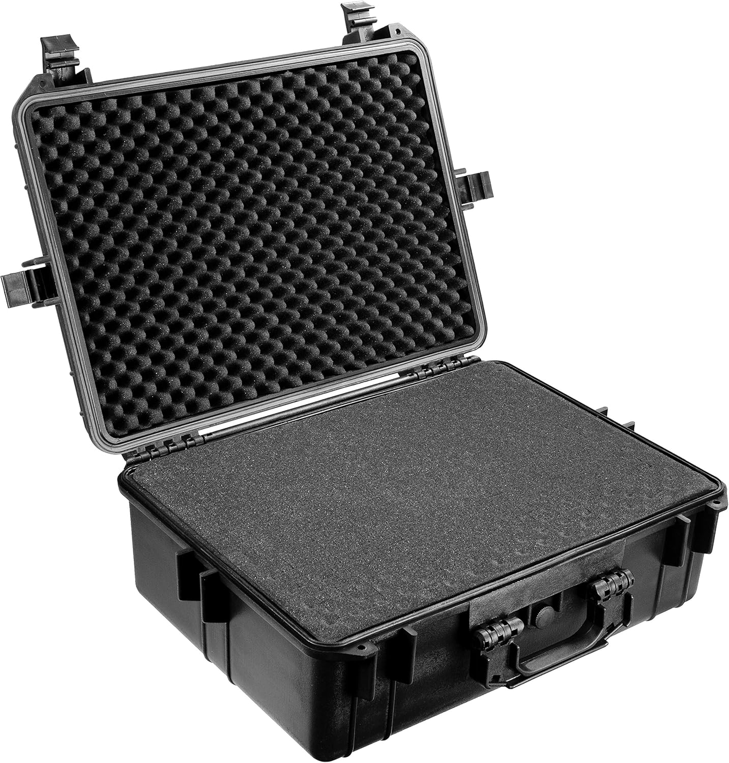 The Eylar 22.4" inch large protective camera hard case is designed to secure your equipment for transport or storage. Check cameras and equipment safely with TSA on flights as we have designed this case to meet TSA’s strict requirements for transport on airplanes in the USA (TSA luggage lock fittings). Injection molded from reinforced high pressure polypropylene plastic that is waterproof and crushproof. A waterproof seal is formed when the case is latched closed applying pressure to a rubber gasket that is molded to the perimeter of the case. Fully submerged waterproof protection for up to 1 meter. Resistant to extreme heat and freezing cold with a working temperature range of -20° F (-29 ° C) to 140° F (60 ° C). This hard camera case comes with 3 layers of foam designed to keep your valuables firmly in place, 2 solid foam layer Pad, 1 layer of egg-crate foam layer. Four press & pull snap latches secure the full length of the hard case. Fit multiple full sized DSLR cameras and lenses securely with an inner storage area of : 19.88" x 13.77" x 5.51" inches. Two pad lock adaptable fittings allow for secure storage at home or on the go. Featuring edge to edge crushproof protection up to 3,000 lbs of directly dispersed weight. Innovative pressure equalization valve allows the case to quickly equalize to different air pressures. Uniform ridges on the top and bottom create a in line stackable design for multi case transport. A deep top lid allows for storage or added protection on the top of the case. Built to last Eylar cases are backed by a limited lifetime warranty.