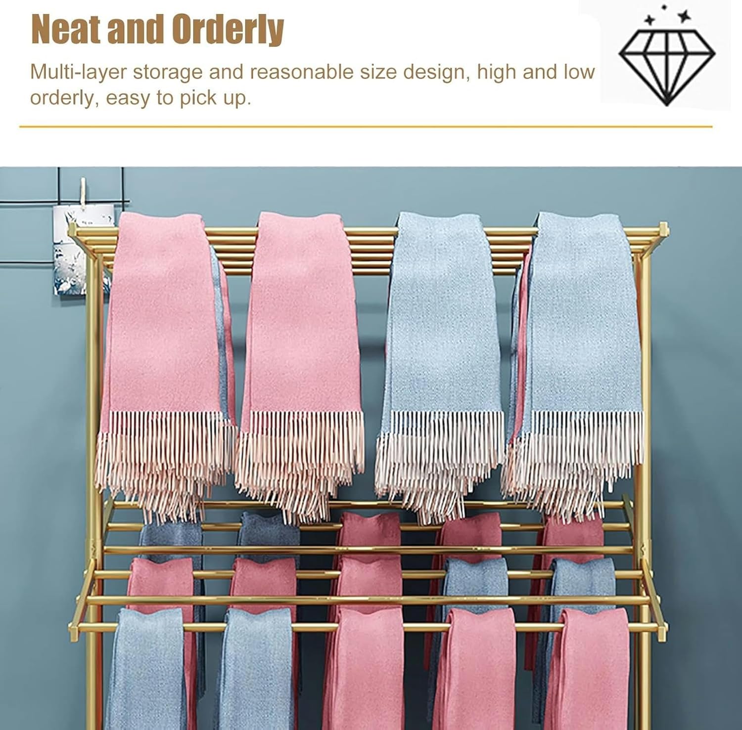 ●Description:This multifunction rack is an excellent choice for home, store for all types of items! A metal finish gives the rack a polished look while durable construction ensures that you won't have to deal with a rack that won't last.●Specifications:Material: Metal IronColor: Black White GoldStyle: Modern Height: 145- 152cm(57-59.8in)Width: 50cm/19.7inLength: 80cm/31.5inScenes: Home, craft room, apartments, hotels, living room, flower shop, shopping mall, retail stores, Cloakroom, etc●Features:Heavy weighted base for stability.The scarf rack organizer is made of the strong steel with a durable rust-resistant finish.All tools included. Follow the step by step instruction to assemble effortlessly.universal standing rack fits along a wall, in a corner, or anywhere you need smart organization.● Package Includes:1 x Scarf Rack● Note:There may be an error of 1-3 cm due to manual measurement.There may be chromatic aberration due to the difference between the recording lamp and the display. Please refer to the actual product.