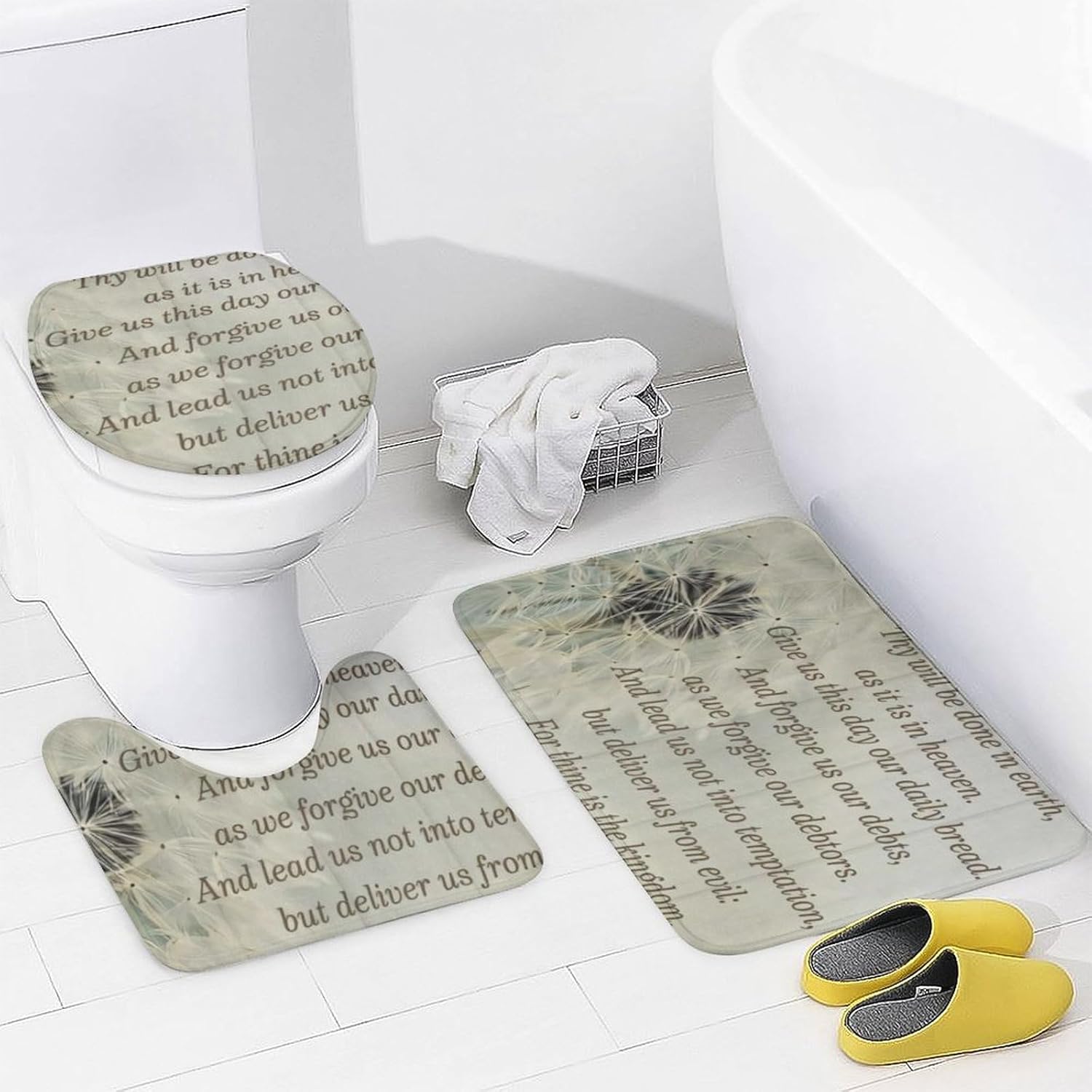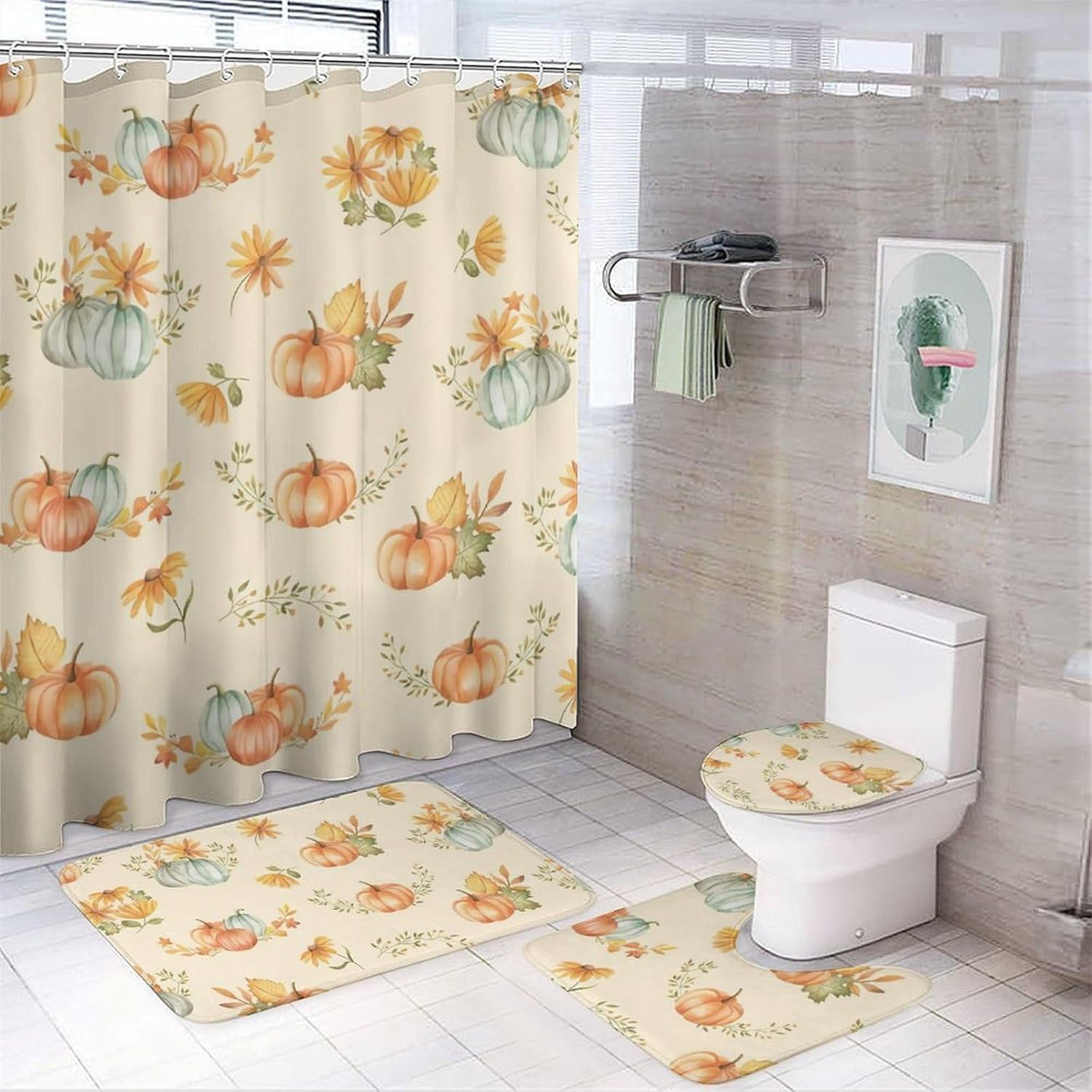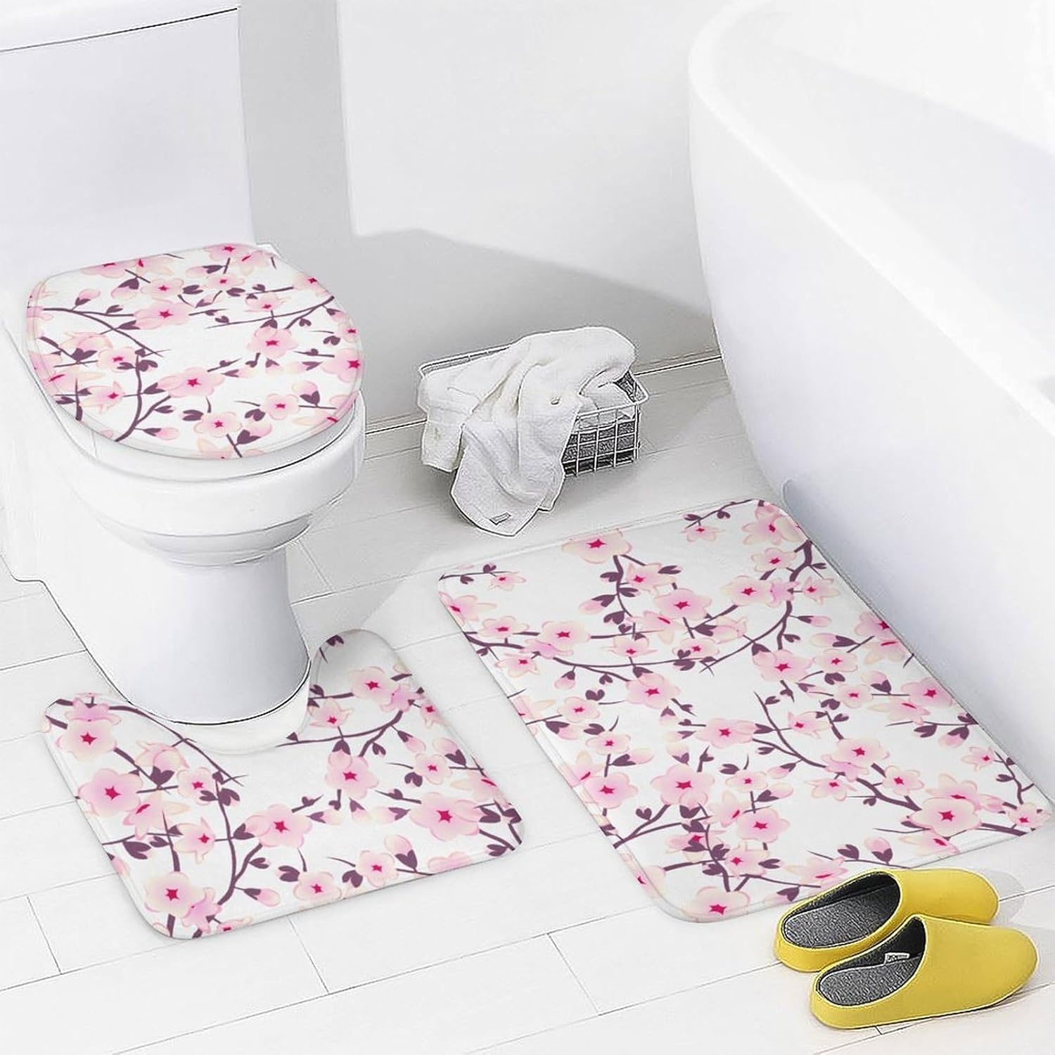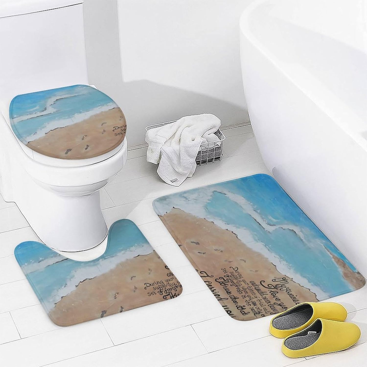 This four piece bathroom set is designed to enhance your daily bathing experience, seamlessly combining functionality with aesthetic appeal. This is the perfect choice to refresh the bathroom space. The bath mat provides a cloud like touch, providing ultimate comfort for your feet, and every step brings a comfortable embrace.The shower curtain has undergone a special coating treatment making cleaning effortless. Their unique printing designs effortlessly complementing various decorative styles.Whether it's awakening vitality in the morning or soothing the body and mind at night, this four piece bathroom set will create a tidy and stylish private bathing space for you.