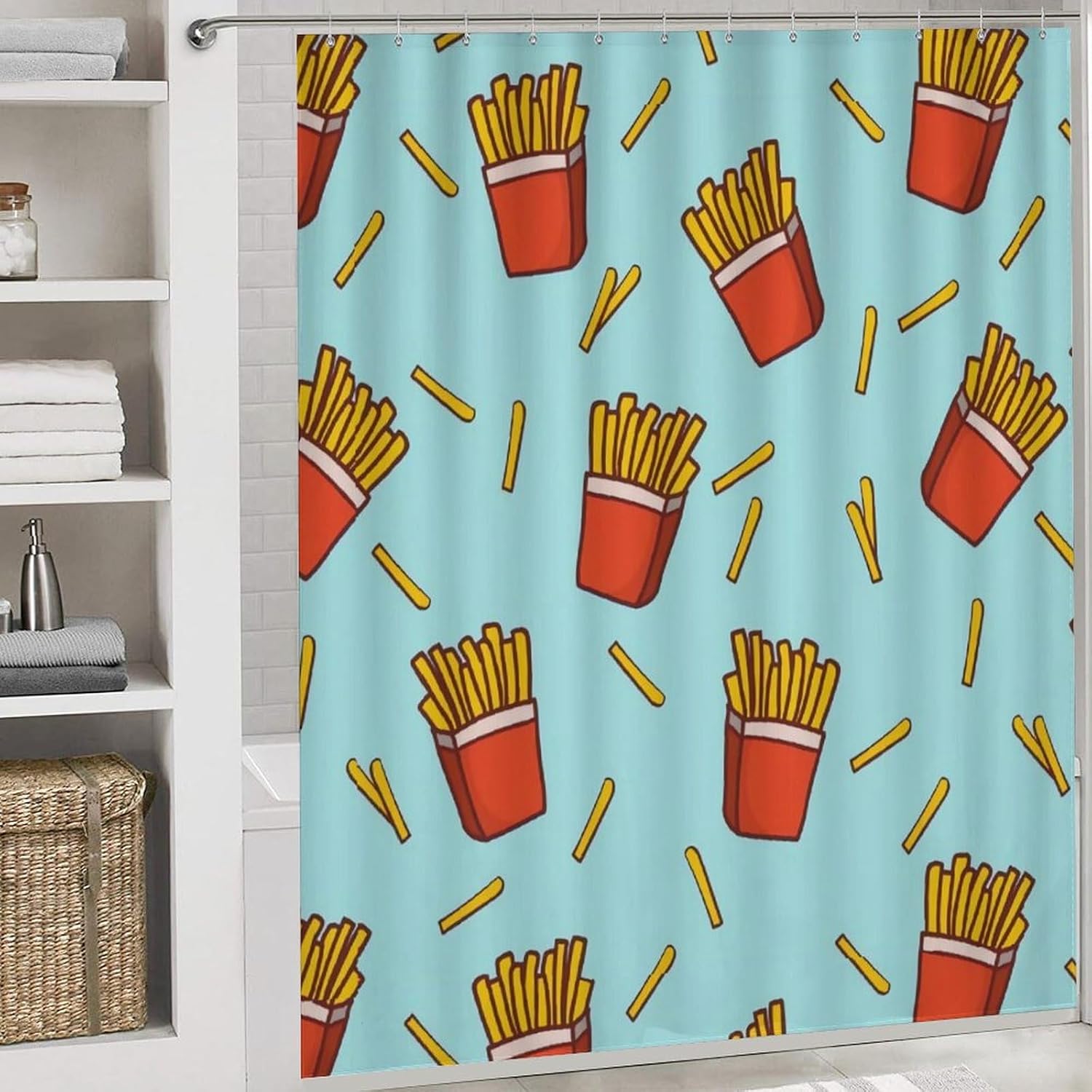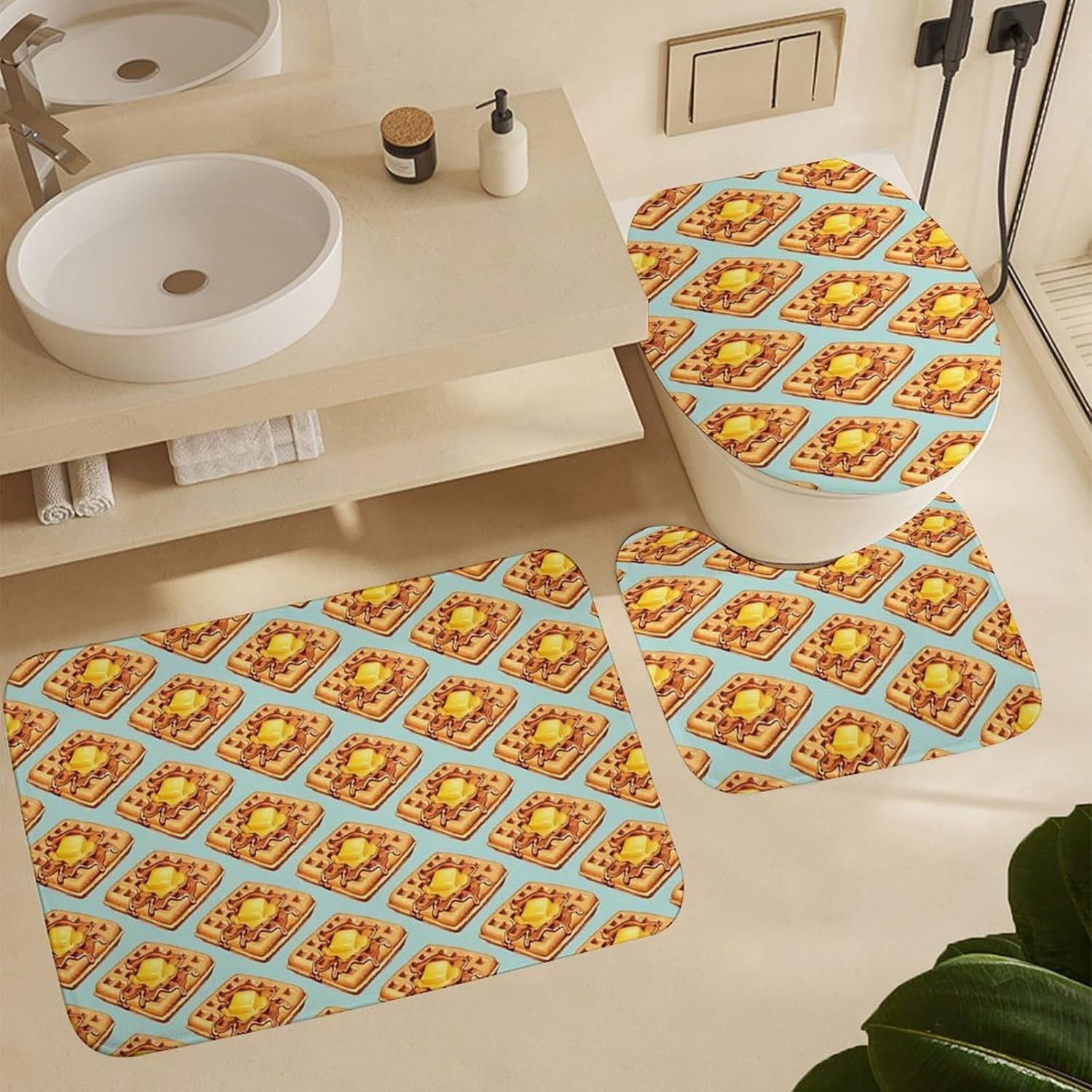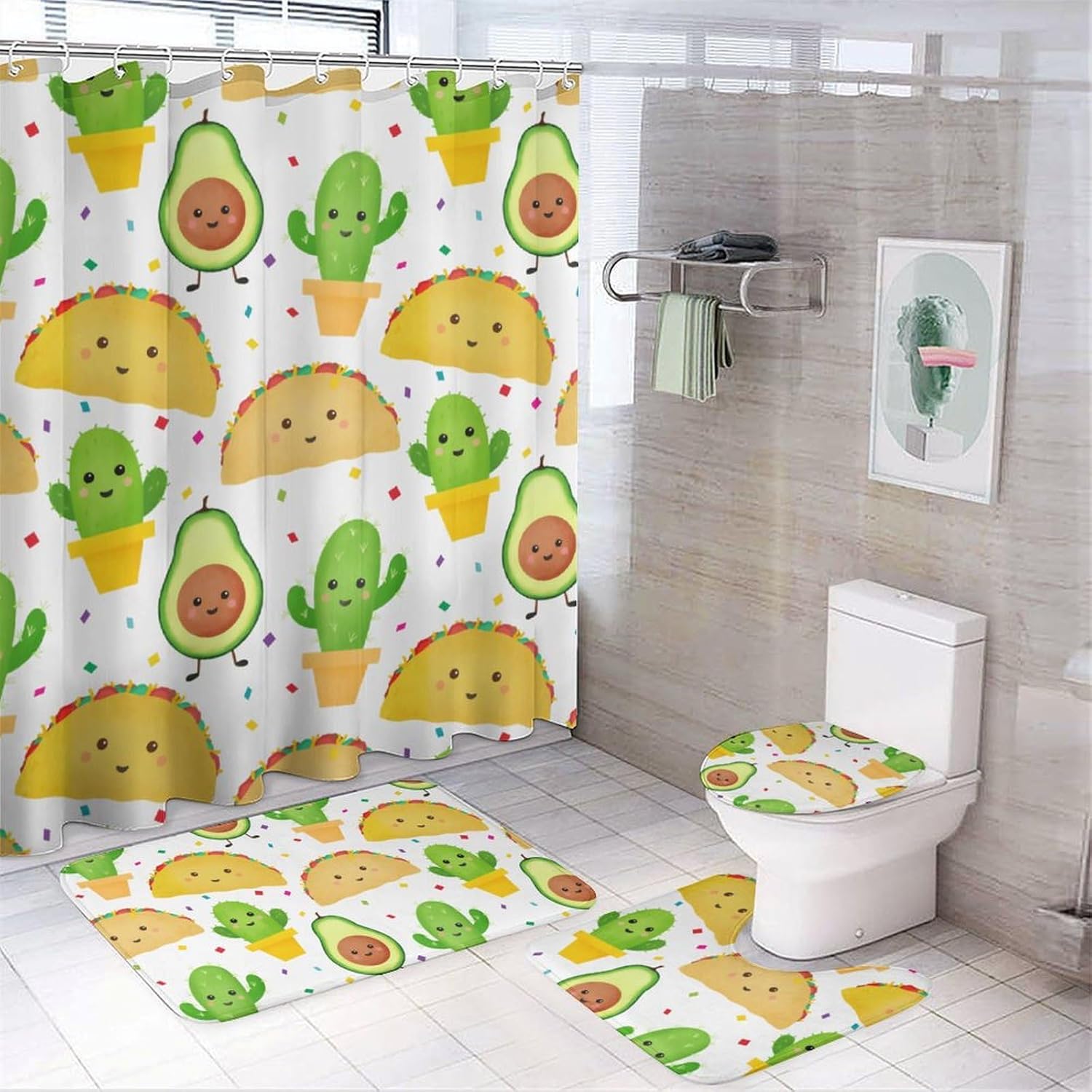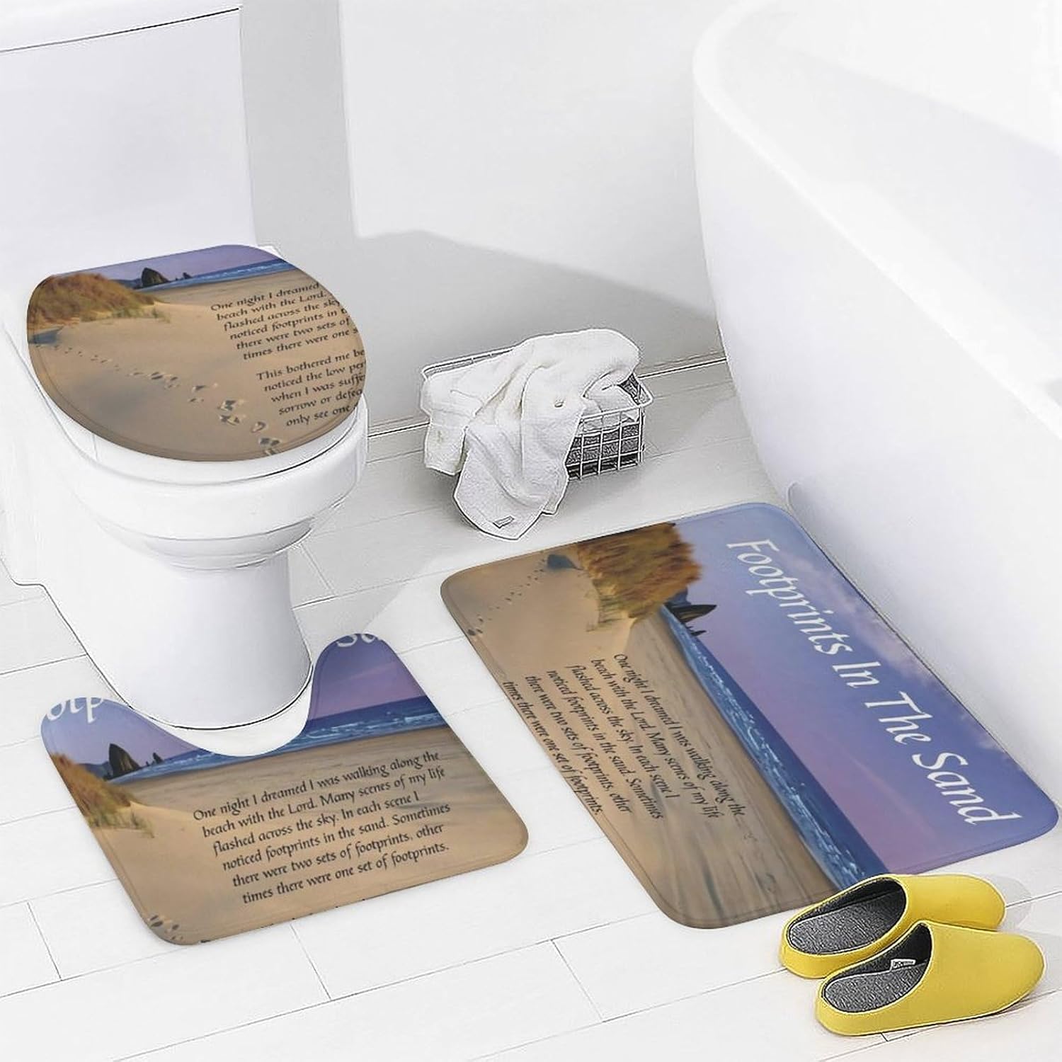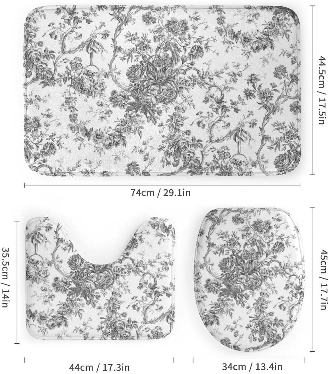 This four piece bathroom set is designed to enhance your daily bathing experience, seamlessly combining functionality with aesthetic appeal. This is the perfect choice to refresh the bathroom space. The bath mat provides a cloud like touch, providing ultimate comfort for your feet, and every step brings a comfortable embrace.The shower curtain has undergone a special coating treatment making cleaning effortless. Their unique printing designs effortlessly complementing various decorative styles.Whether it's awakening vitality in the morning or soothing the body and mind at night, this four piece bathroom set will create a tidy and stylish private bathing space for you.