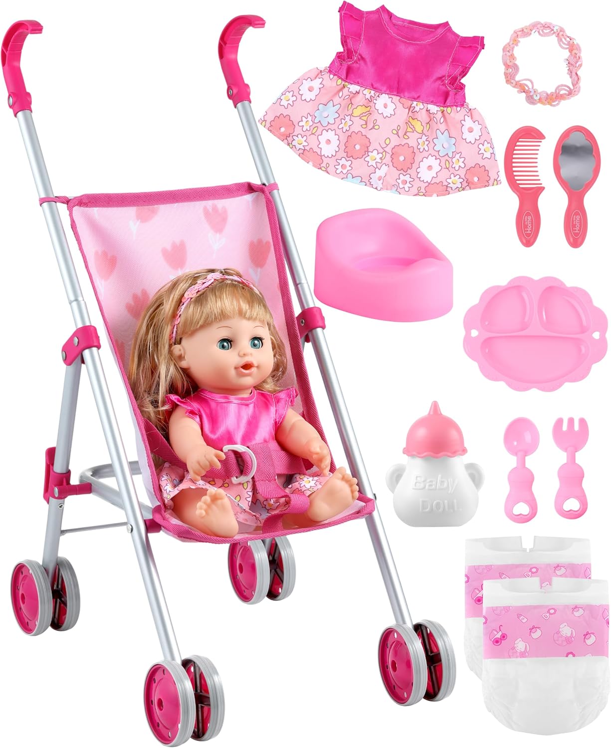 | Included Components | 1 x doll stroller, 1 x 12" baby doll, 2 x outfits, 1 x bottle, 1 x diaper, 1 x doll potty, 1 x pacifier, 1 x teething toy, 1 x plate, 1 x cutlery set. |