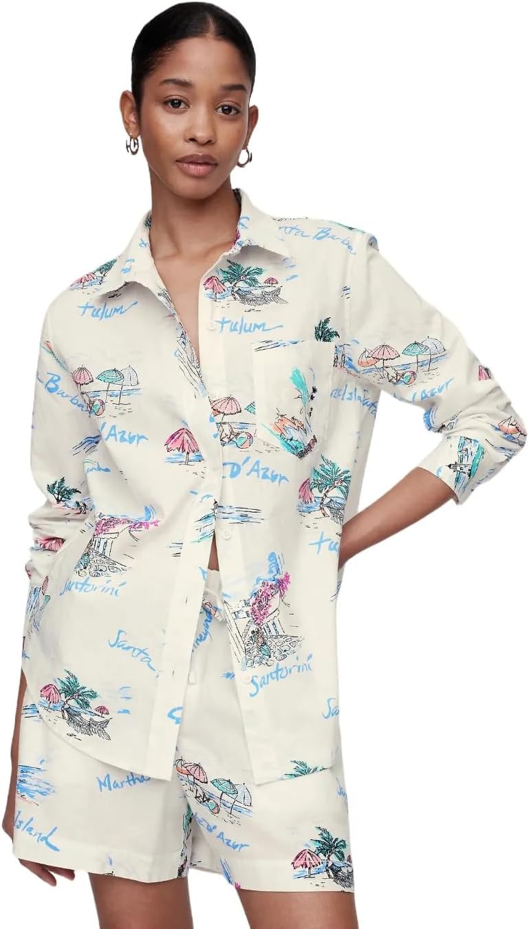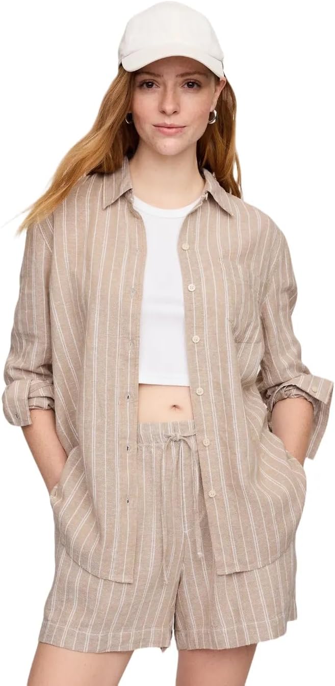 This shirt perfectly blends the timeless appeal of linen with modern design elements, creating a piece that's as versatile as it is fashionable. Made from a smooth linen blend, this shirt offers a lightweight and breathable feel, making it ideal for warm days or for layering under sweaters and jackets. The classic design, featuring long sleeves with button cuffs, a spread collar, and a button front, ensures this shirt will remain a staple in your wardrobe for seasons to come. Attention to detail is evident in the practical patch pocket at the chest and the modern silhouette created by the curved shirttail hem, which is slightly longer at the back. These elements combine to elevate the classic shirt into a contemporary masterpiece. The relaxed, straight fit promises a comfortable and flattering look for any body type, making this shirt a versatile addition to any outfit. Whether dressed up for the office or down for a casual day out, the GAP Women's Linen Easy Shirt in Sp Blue Stripe is sure to become a favorite in your clothing rotation.