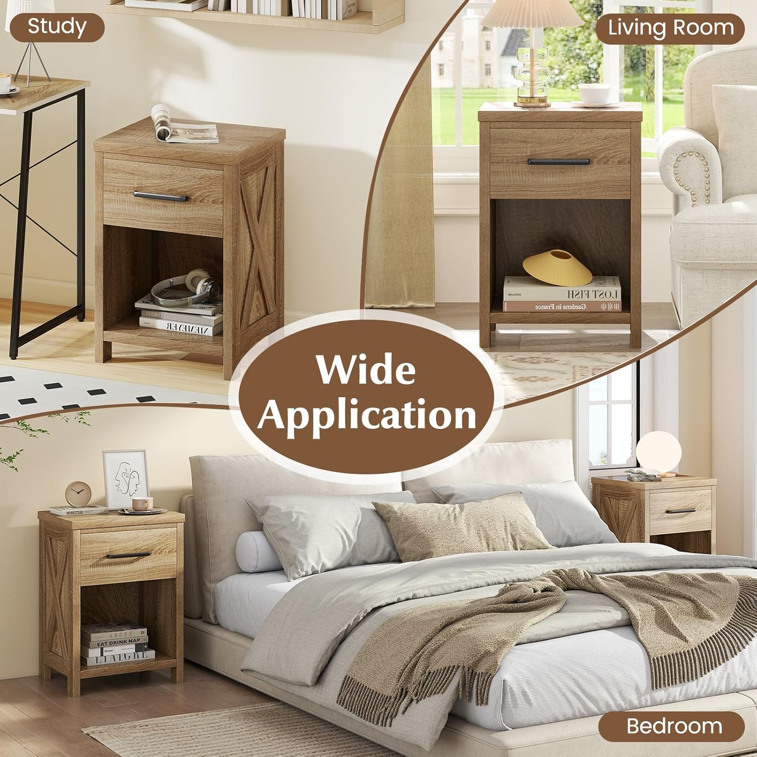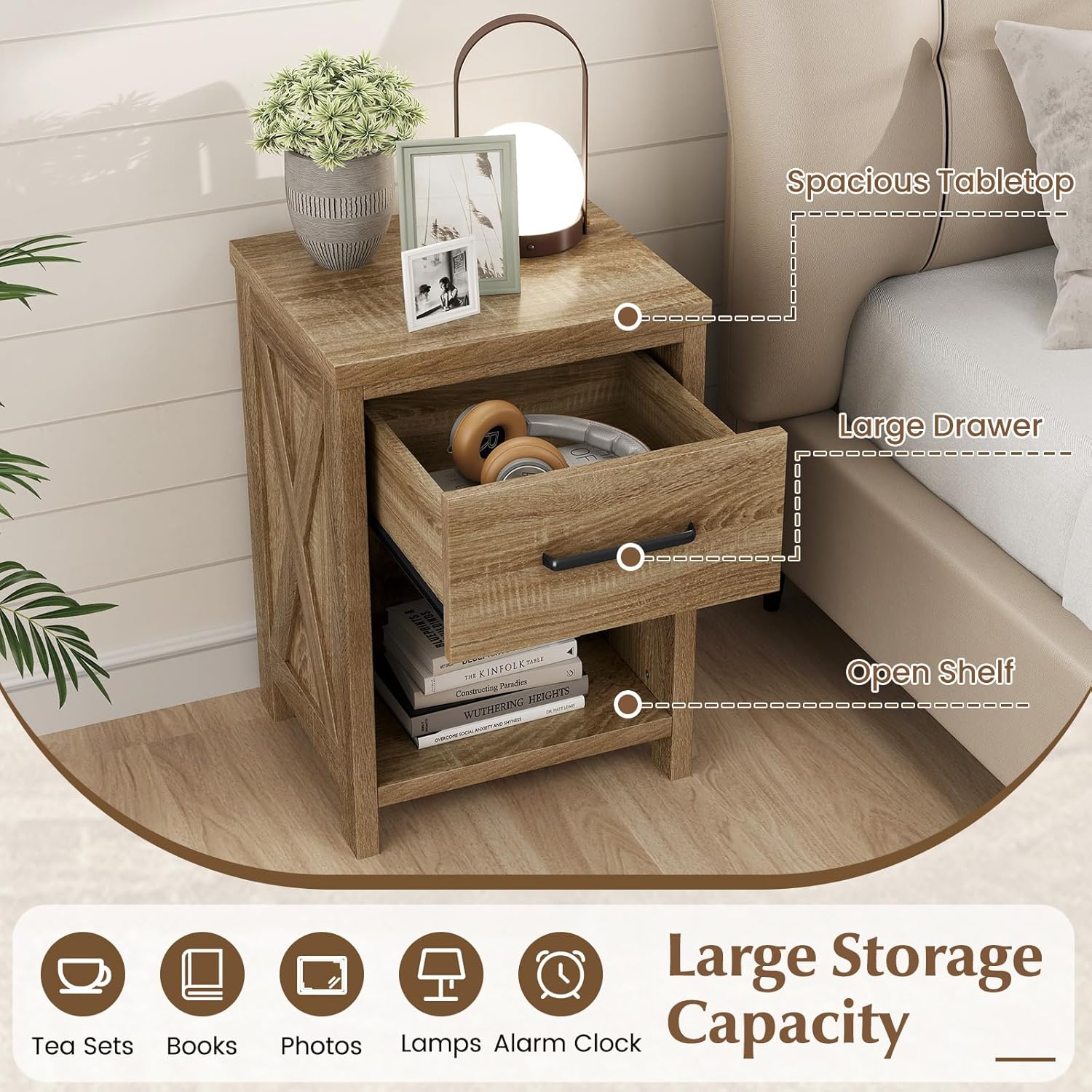 Description:Bring charm, function to your space with this beautifully crafted 18"L x 15.5"W x 26.5"H farmhouse-style nightstand. Thoughtfully designed for everyday convenience, it features a spacious tabletop for your bedside essentials, a deep drawer for private storage, and an open lower shelf perfect for books, décor, or baskets. Built with a sturdy wood frame and reinforced with metal screws and fasteners, this nightstand is made to last. The signature X-pattern side panels add a rustic farmhouse flair, blending warmth and elegance effortlessly. Whether placed in the bedroom, living room, or guest room, it serves as a reliable nightstand, side table, or accent piece.Designed with user comfort in mind, it includes smooth-glide metal drawer slides, a sleek metal handle, and protective foot pads that prevent floor damage. It's a multifunctional, stylish solution for your home organization needs.Features:Spacious tabletop provides quick access to lamps, phones, or drinksDeep drawer offers enclosed storage for personal itemsOpen bottom shelf ideal for books, baskets, or décorSmooth metal drawer slides ensure quiet, effortless operationReinforced with screws and fasteners for added structural strengthProtective foot pads prevent scratches on hardwood or tile floorsFarmhouse X-side design adds rustic charm and visual appealVersatile use as a nightstand, end table, or small storage unitSpecifications:Color: NaturalMaterial: MDF, Engineered WoodOverall Dimensions: 18" x 15.5" x 26.5" (L x W x H)Inner Size of Drawer: 13.5" x 13" x 5" (L x W x H)Size of Bottom Shelf: 15.5" x 15" x 13" (L x W x H)Load Capacity of Tabletop: 55 lbsLoad Capacity of Drawer: 22 lbsLoad Capacity of Bottom Shelf: 22 lbsNet Weight: 36.5 lbs1 x Nightstand1 x User Guides