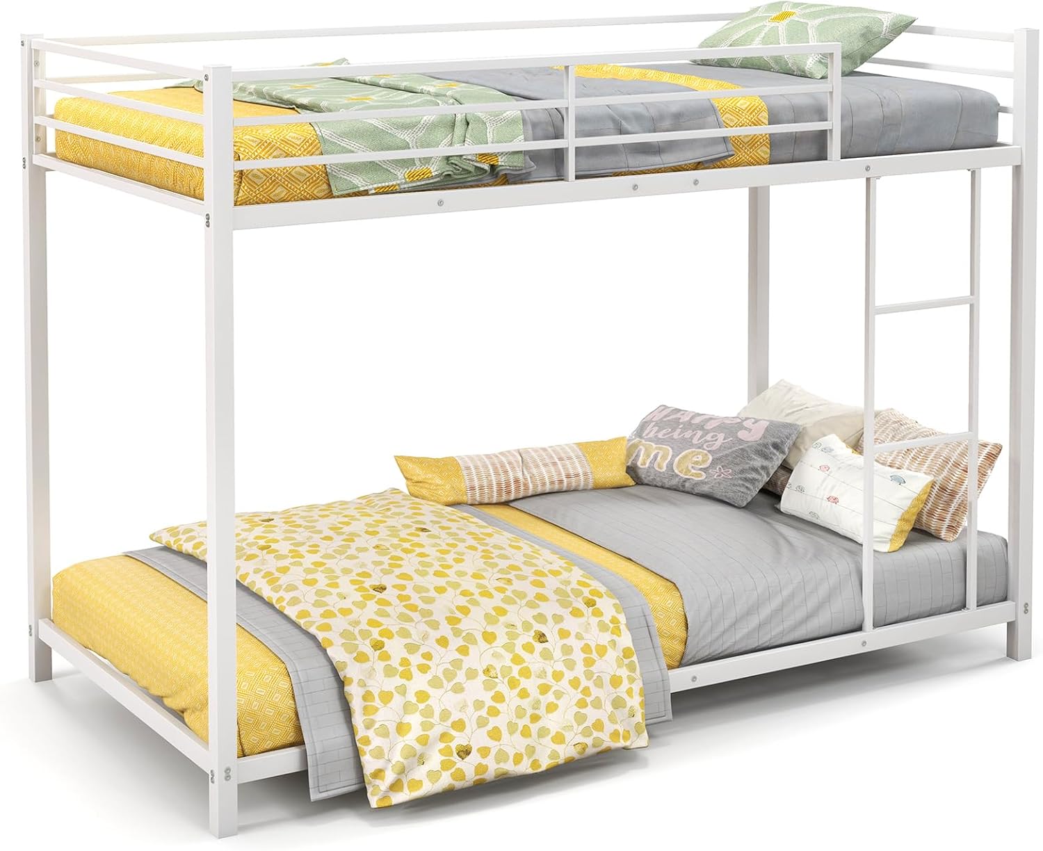 Description: The twin-over-twin metal bunk bed is the perfect solution for families seeking a comfortable and secure sleeping experience for multiple children. It features a compact design that accommodates low-ceiling bedrooms or limited space and complements various home decoration styles. Each bed has sturdy metal slats to allow sufficient air flow and prevent mattress sagging, and no box spring is required. For safety concerns, the top bunk is surrounded by 10" full-length guardrail, with an opening for easy entrance. What’s more, the solid metal frame does not deform or shake, yet with a powder-coated surface for an extended lifespan. Features: Low profile bed is perfect for low ceilings and little children With safety guardrail to protect sleeper on the top bunk Metal slats are firmly connected for a noise-free sleep Robust construction ensures a large bearing capacity Made of high-quality material for a long service life Safe & sturdy ladder makes it easy to climb onto the bed Simple and modern style matches various room decorations Do not use a mattress more than 5" thick on the top bunk Specification: Color: Black/Sliver/White Material: Metal Overall Dimensions: 78" x 41" x 54" (L x W x H) Height between Bunk Bed: 38.5" Height of Guardrail: 10" Recommended Mattress Size: Twin (not included) Weight Capacity of Each Bed: 330 lbs Weight Capacity of Ladder: 330 lbs Net Weight: 75 lbs Note: The mattress surface of the upper bed must be at least 5" below the guardrail Package Includes: 1 x Metal Bunk Bed 1 x Instruction Why You Choose Our Low-profile Bunk Bed? √The low profile bunk bed is of the perfect size for kids’ room. √The floor bunk bed is safe and sturdy for kids and adults.