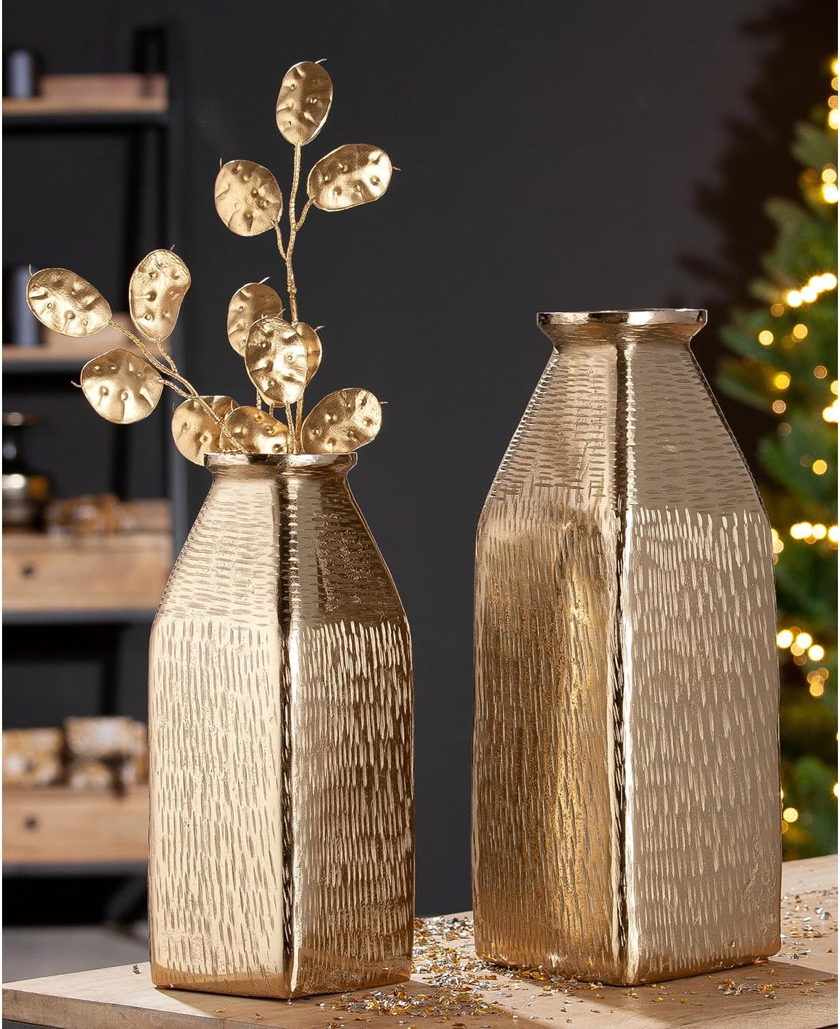 The GILDE vase Lola is an elegant home accessory that impresses with its gold-coloured surface made of high-quality aluminium. With a height of 38 cm and a width and depth of 13 cm each, the vase blends harmoniously into any decor and sets stylish accents. Thanks to its waterproof properties, the Lola vase is ideal for fresh floral arrangements and adds a touch of luxury to your home. The elegant gold colour scheme underlines the timeless design and makes the vase a versatile decorative object that finds its place in both modern and classic interiors. The GILDE Vase Lola is not only a functional vessel, but also an artful statement piece that will enhance your living spaces.