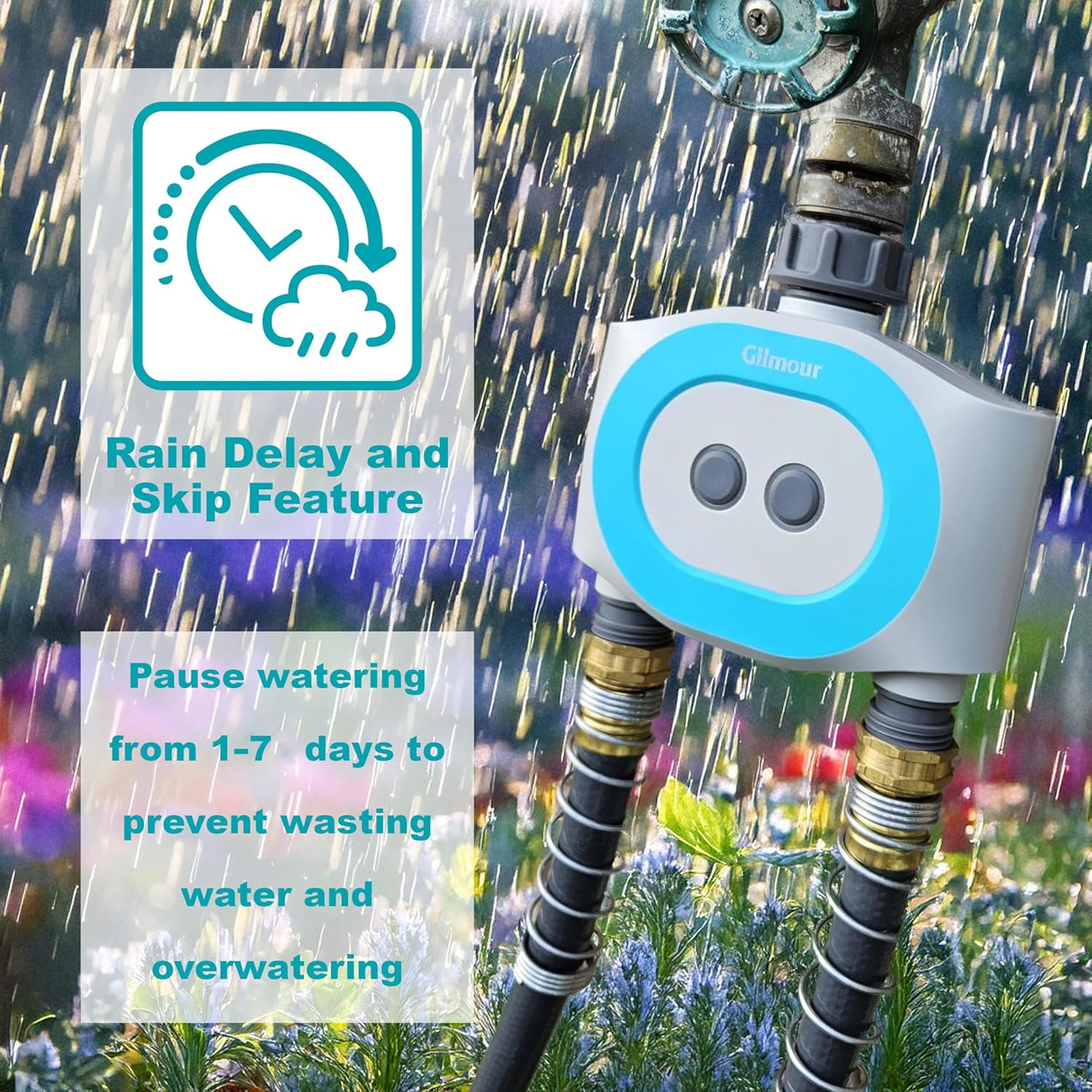 Gilmour's dual outlet smart water timer for garden hose is the ultimate time-saving, water-saving, money-saving tool for your lawn and garden. Simple to set up and easy to use all season long. The easy swivel coupling allows for a quick and durable connection between water hose timer and the spigot and hose. This hose timer for watering can run anywhere between 1 to 360 minutes at a time. Timer for water hose automatically turns water off when you want it to creating an efficient garden watering system.