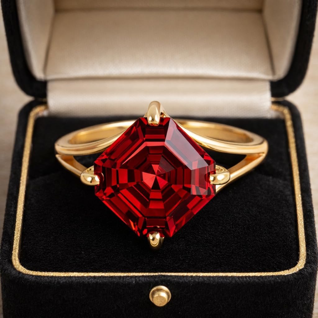 This stunning hexagon cut red garnet ring is a beautiful blend of modern geometry and timeless elegance. Crafted in radiant 14K yellow gold, the ring showcases a vibrant lab-created red garnet solitaire with step-cut facets that create depth, brilliance, and a bold statement. The split shank gold band adds a refined, contemporary touch while ensuring a comfortable fit for everyday wear. The secure prong setting highlights the stone’s unique hexagon shape, making this ring both eye-catching and durable. Whether chosen as an engagement ring, promise ring, or statement piece, this garnet ring symbolizes passion, love, and strength—designed to be cherished for years to come.
