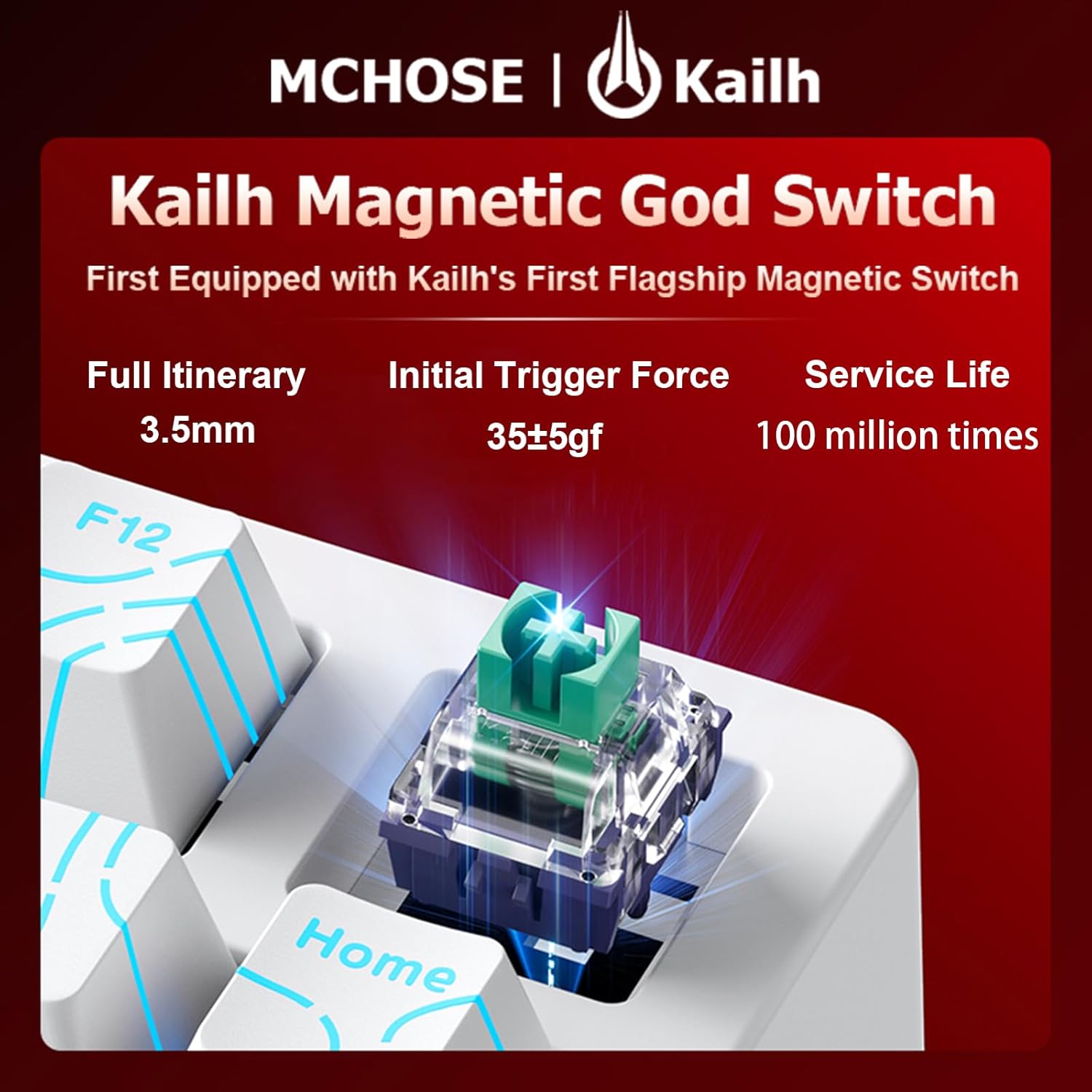 MCHOSE Jet 75 Magnetic Game machinery Keyboard In today's competitive gaming environment, choosing a high-performance keyboard is crucial. The MCHOSE ACE 60 Pro series gaming magnetic switch keyboard is designed for players who pursue excellence, making it the ideal choice for mainstream gamers. High-Performance Magnetic Switches The MCHOSE Jet 75 series features self-developed magnetic switches, paired with a non-memory-consuming network card driver, supporting polling rates of up to 8000Hz. This means that each keystroke can achieve an ultra-fast 128K scanning, ensuring quick response times and giving you an edge in gameplay.