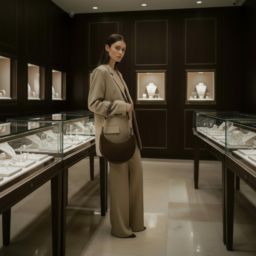 This Italian mixed leather purse features a crescent silhouette crafted from genuine suede with a soft matte texture, accented by pebbled calfskin on the sides, handles, and trim. The contrast between velvety suede and textured calf creates depth and tactile richness, highlighting refined craftsmanship. Compact in size (9.8"" L × 3.1"" W × 5.1"" H, 12.3 oz), it is light yet structured for daily wear. Two interchangeable straps add versatility: a short handle with polished gold-tone carabiners for hand or shoulder carry, and a slim adjustable strap for crossbody wear. Decorative leather cones with rivets at the handle base emphasize artisanal detail. The main compartment closes with a smooth gold-tone zipper and leather pull tab. Inside, a durable polyester twill lining offers one roomy compartment to fit essentials like wallet, phone, keys, or a small notebook. Carefully finished edges and tone-on-tone stitching complete the design, affirming its Made in Italy origin.