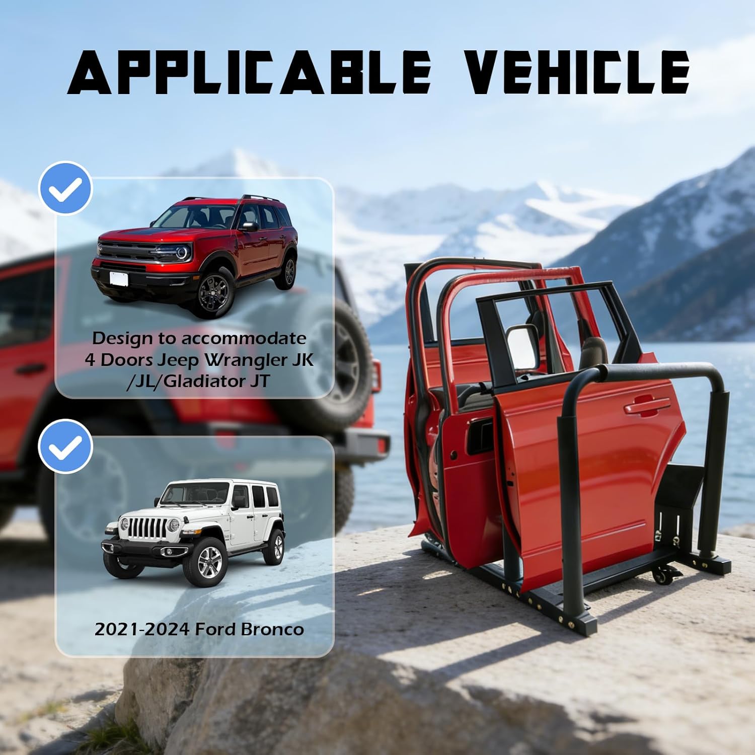 This heavy-duty door storage rack offers secure, space-saving storage for your Jeep Wrangler or Ford Bronco doors. Its universal compatibility, robust laser-welded steel frame, and protective EVA padding ensure your doors stay safe. Four caster wheels (two locking) provide easy mobility, while the vertical design maximizes garage space. It's the complete solution for organization, protection, and portability.