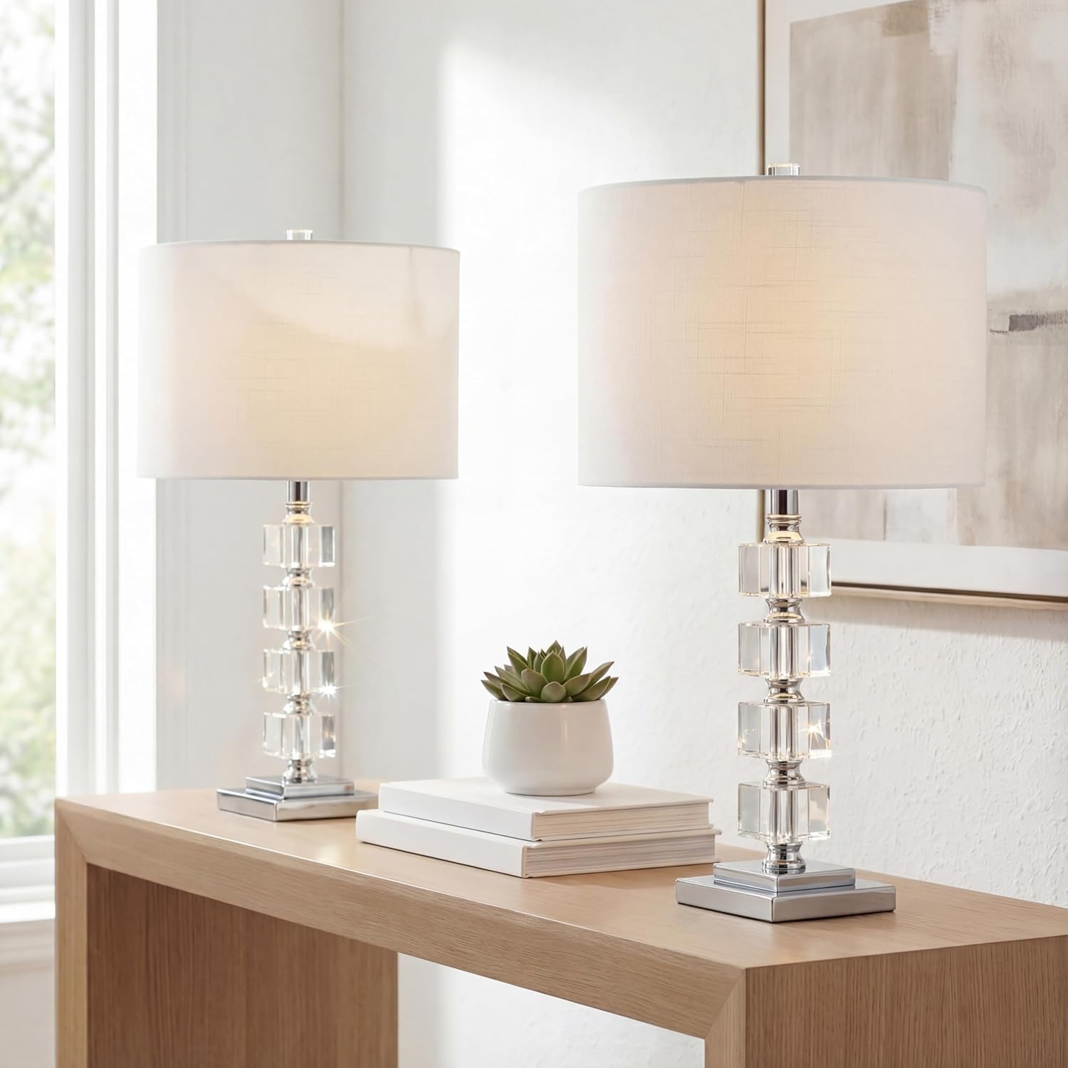 Add sparkle to any room with this contemporary crystal glass table lamp. The body features stacked cubes of clear crystal accented by chrome fittings. This appealing design is topped with a white fabric drum shade.