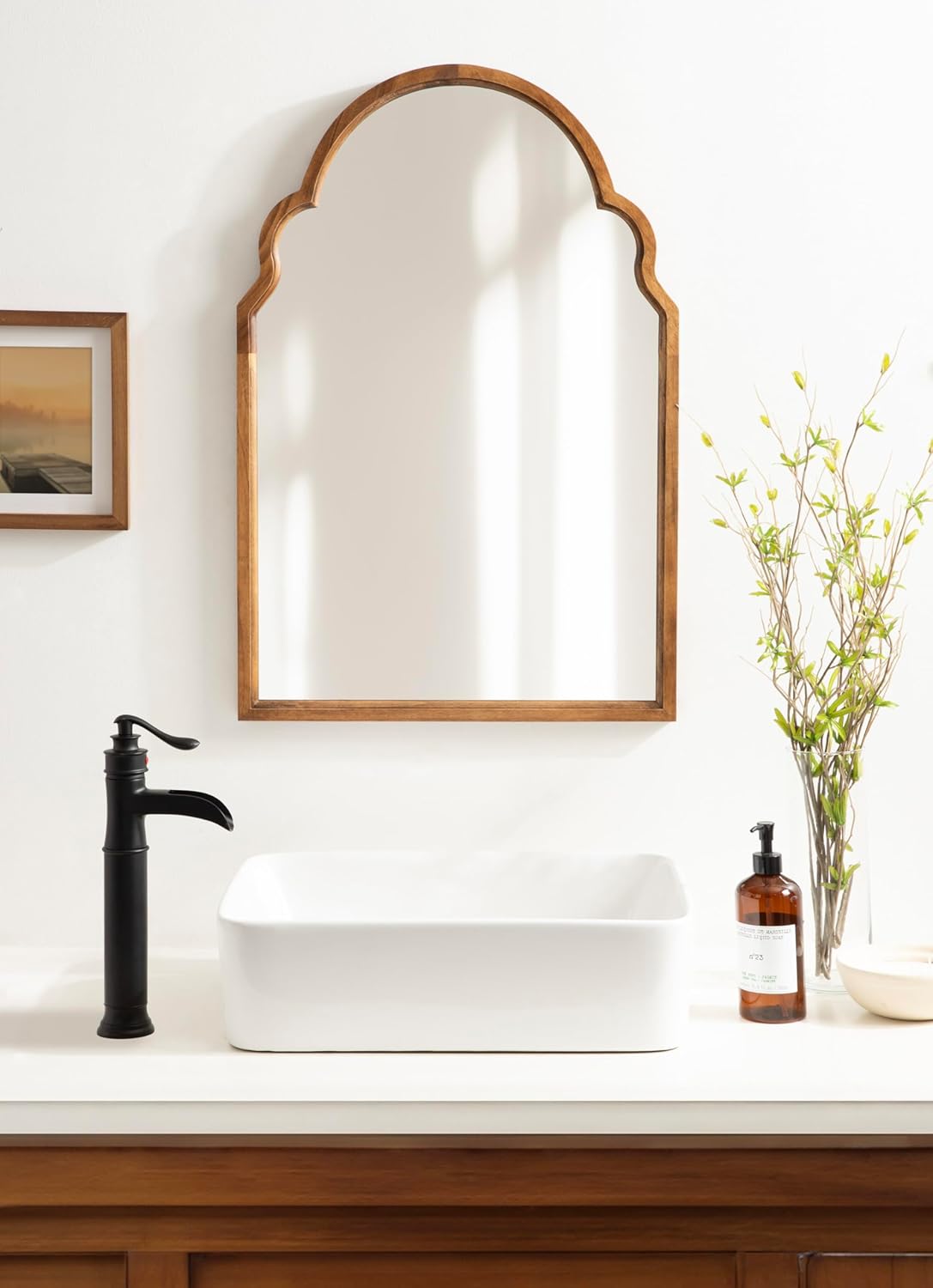 The Hogan wall mirror uses farmhouse charm to create a bold wall display in your home. The Hogan mirror features a beautiful, Moroccan-inspired arched shape, complete with scalloped corners on either side of the piece. This lovely design draws the eye into a breathtaking focal point, creating the ultimate statement for any wall. Its scalloped frame was crafted from a rich wooden material, giving it a resilient quality and a sophisticated look. The Hogan mirror's overall dimensions are 20 inches wide by 1 inch deep by 30 inches tall, creating a staggering display in your bedroom, entryway, living room, or office. You could also add the Hogan mirror to your bathroom to make a vanity. Adding a decorative mirror like the Hogan to your wall enhances the space it's in by spreading light, making it appear more vibrant and dimensional. The elegant Hogan mirror hangs in only a matter of minutes, utilizing resilient metal D-ring hangers attached to the back of its poplar wood frame. This means the hanging process is quick while still providing the needed security for this statement mirror.