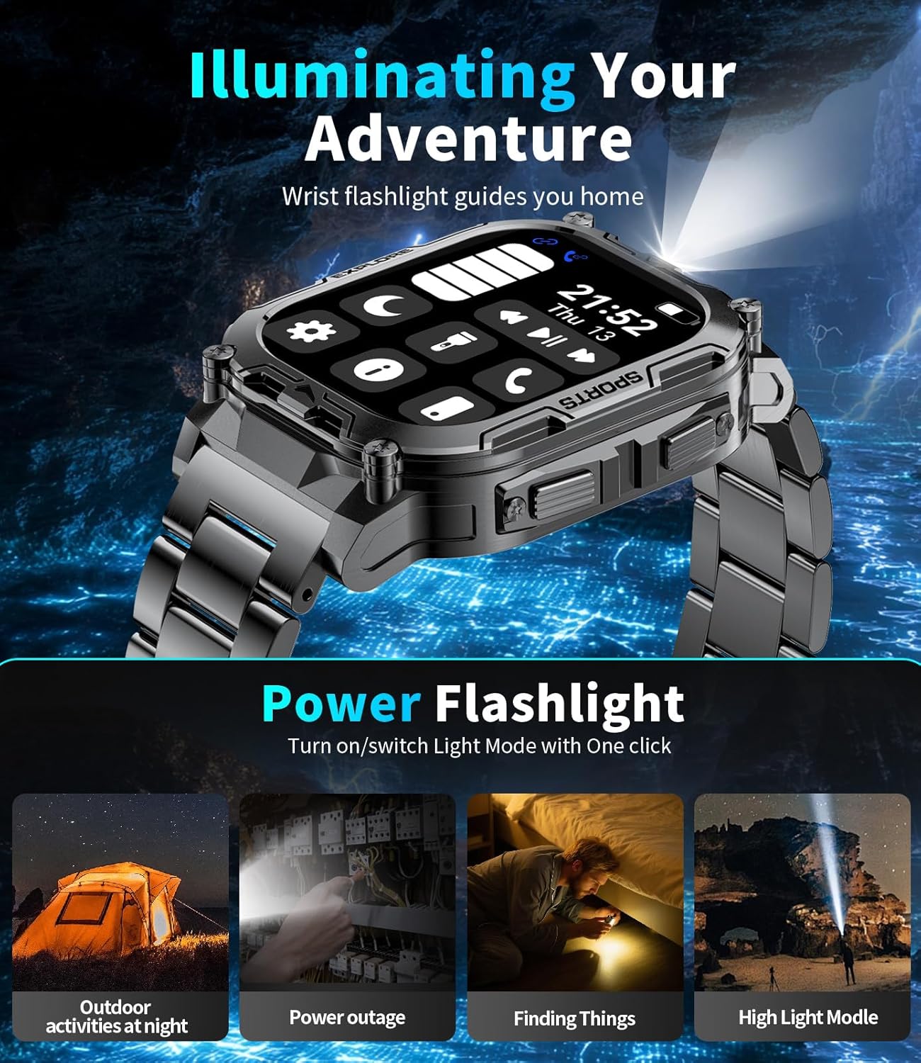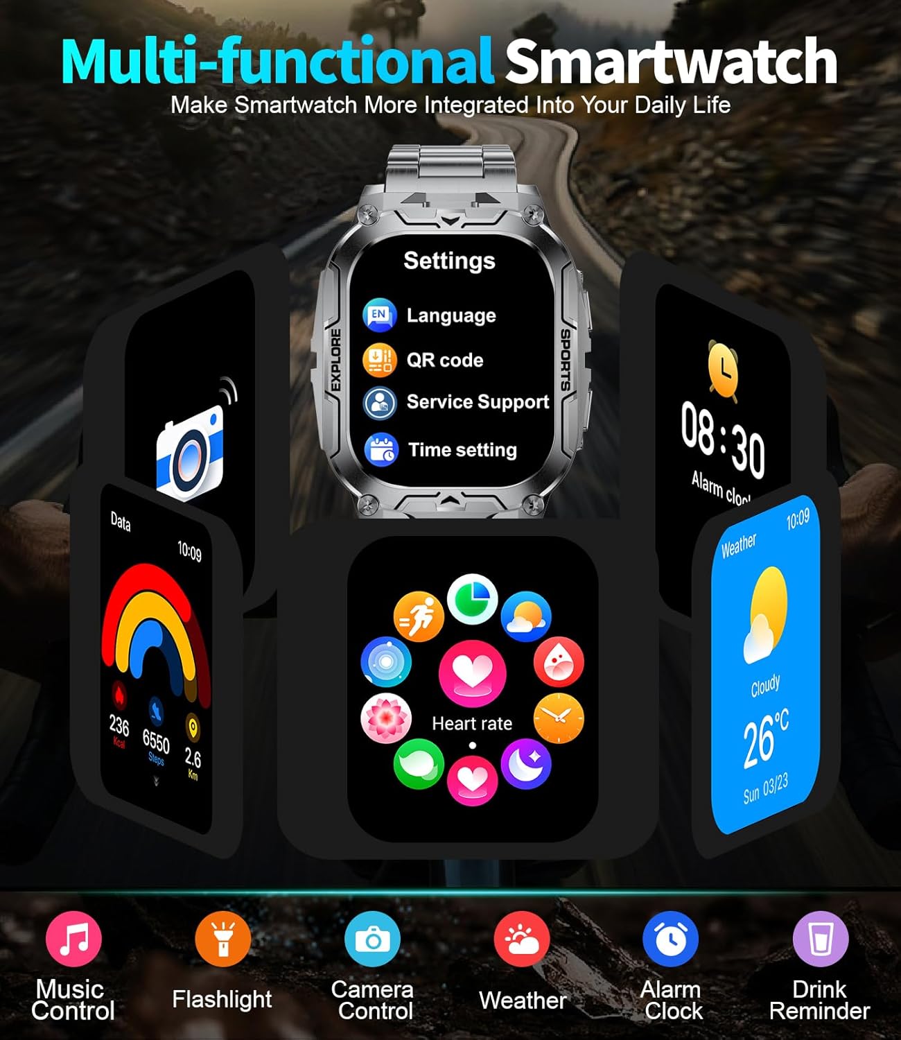 | Additional Features | Large Dial Bluetooth calls, notifications, voice assistants,100 sport modes,stopwatch, health tracker, alarm clocks,timer,weather forecast, password lock, find watch & phone, calculator, collection code, business card, 27 languages, pedometer, distance, calories,music&camera control, do not disturb mode, brightness setting, Multisport Tracker, Notifications, Phone Call, Time Display |