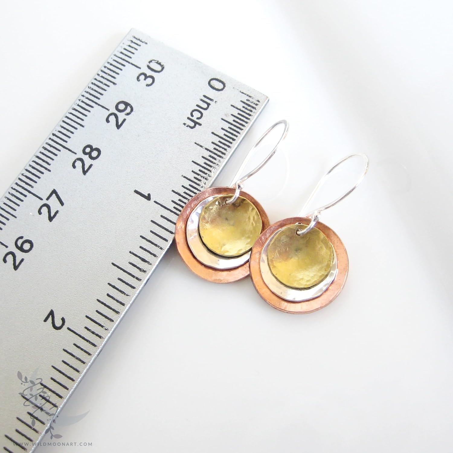 Tri-tone Mixed Metal Hammered Copper, Brass & Sterling Silver Petite Circle Earrings ·These raw copper, raw brass & Sterling Silver coins were hand hammered for texture, formed and shaped into gentle concave discs, and suspended from handmade sterling silver ear wires. These dainty earrings are a wonderful little everyday earring with a minimalist, versatile design and a boho aesthetic......................................... MEASUREMENTS: - Earrings length: small/petite - approx 1.25" (3.1cm) total length Jewelry will arrive in a decorative organza bag. ........................................ONE-OF-A-KIND: All of the jewelry at Wild Moon Art & Jewelry is meticulously & individually hand crafted by me. As such, each piece of jewelry will be wonderfully unique. The color graduations, inclusions, wire wrapping or the way the stones catch the light may slightly differ, but I ensure every piece is beautiful & extremely similar to the photo representation.