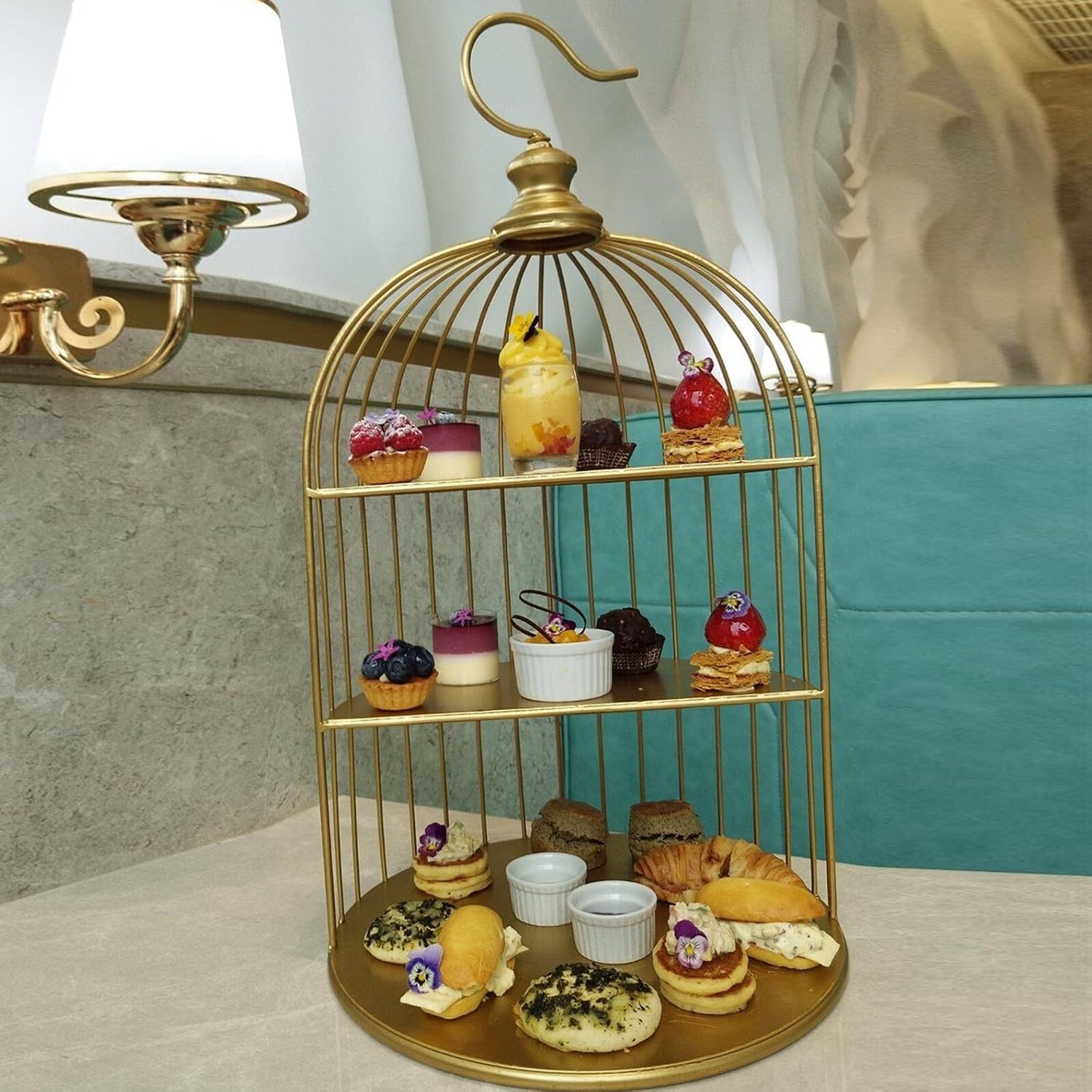 Package Include1 x Cake Display StandFeatures - Color: Golden.- Material: Iron.- Perfect for weddings, parties, birthday parties or any other events.- Size: 46.00X25.00X25.00cm/18.08X9.82X9.82in- Made of Iron material, this cage shaped desserts stand is and fashion.- Can be used as cake stands, cupcake stands, dessert display stand, candies, cookies or serve for fruit.Goods InformationCrafted from iron with golden finish, this multi-layer cake stand features a distinctive bird cage design with three spacious trays, offering both elegance and functionality for dessert presentation. Its wrought iron construction stability and repeated use, transforming any dining or entertaining event into a refined experience. From weddings and birthday parties to casual tea gatherings and holiday celebrations, this cake display stand serves as versatile centerpiece that beautifully showcases cakes, cupcakes, candies, and fruits. The unique cage shape also lends itself to home decor, adding a charming and luxurious touch to any room. Perfect for creating inviting dessert tables, this stand blends practicality withesthetic appeal, making it for those seeking both style and convenience in their serveware collection.From ZHIHUICX was inspired by desire to blend artistry and functionality in home . Our multi-layer cake stand embodies craftsmanship and elegance, turning and special celebrations into cherished memories. Celebrate life’s sweet occasions with ZHIHUICX.