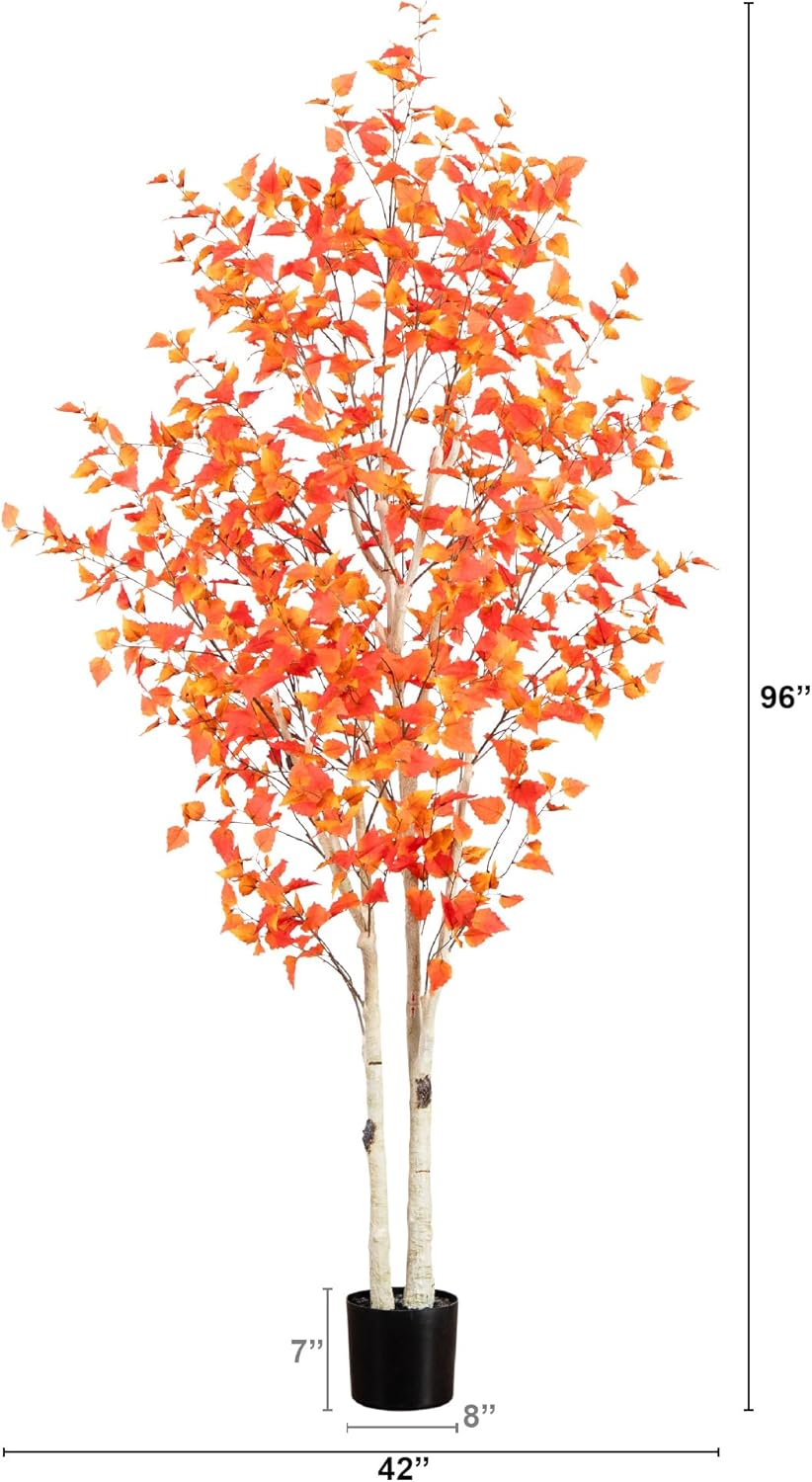 Faux in love with the season's glow with this autumn birch artificial fall tree. It draws from the Northeast's autumnal palette, bringing the richness of fall right into your home. Each leaf, crafted from the finest materials, is a burst of color that seems to sway with the breeze. Personalize your display by shaping the branches as you wish. Standing 8' and set in a simple nursery planter, you can customize with a decorative pot of your choice to fit your decor. Ideal for Thanksgiving or as an faux-ever present nod to fall, this tree offers all the splendor without any of the fuss.