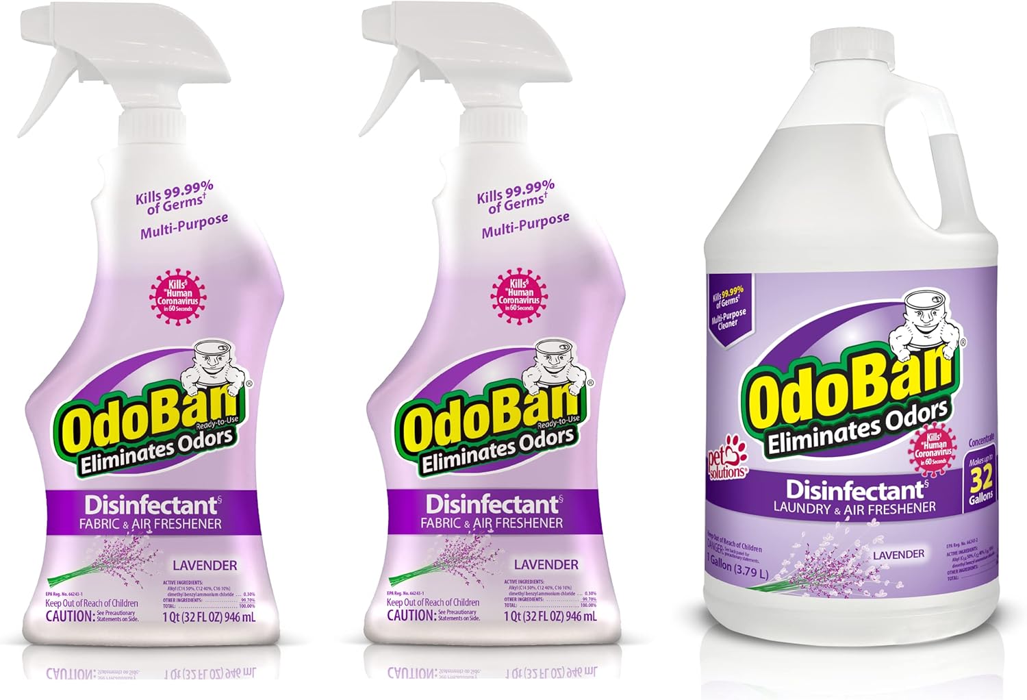 OdoBan Ready-to-Use multi-purpose formula spray does the job of many products in one. The one gallon bottle backup is also great to have on hand for refills when you need them. It's an effective cleaner and sanitizer that leaves no residue, and works effortlessly to disinfect hard, nonporous household surfaces. Kills the Human Coronavirus in 60 seconds when used according to disinfection directions on hard, nonporous surfaces; meets the criteria for inclusion on EPA List N (EPA Reg. No 66243-2). It's also an effective eliminator of harsh aromas and stenches including pet urine aftermath in carpet, upholstery, and more. It can even stand up to the smell of smoke and can be used in sinks, tubs, and for mopping floors and washing walls. Not only is it an exceptional cleaner, but it's a great air freshener and will remove harsh smells from any room. It's also a great way to refresh laundry and fabrics. OdoBan products can be used in both households and business facilities of all types including schools and day cares, hospitals, nursing homes, in ambulances, buses, and trains, in airplanes and taxis, in restaurants and cafeterias; pretty much any place where people commune. When used as directed, OdoBan is safe for use on washable surfaces, including sealed natural stone, stainless steel, ceramic, tile, Formica, fiberglass, rubber, vinyl, terrazzo, and plastic. Safe for use on sealed natural stone countertops and surfaces, like granite, quartz, marble, ceramic, and soapstone. Make Life Fresh with OdoBan. *EPA List N (EPA Reg. No 66243-2)