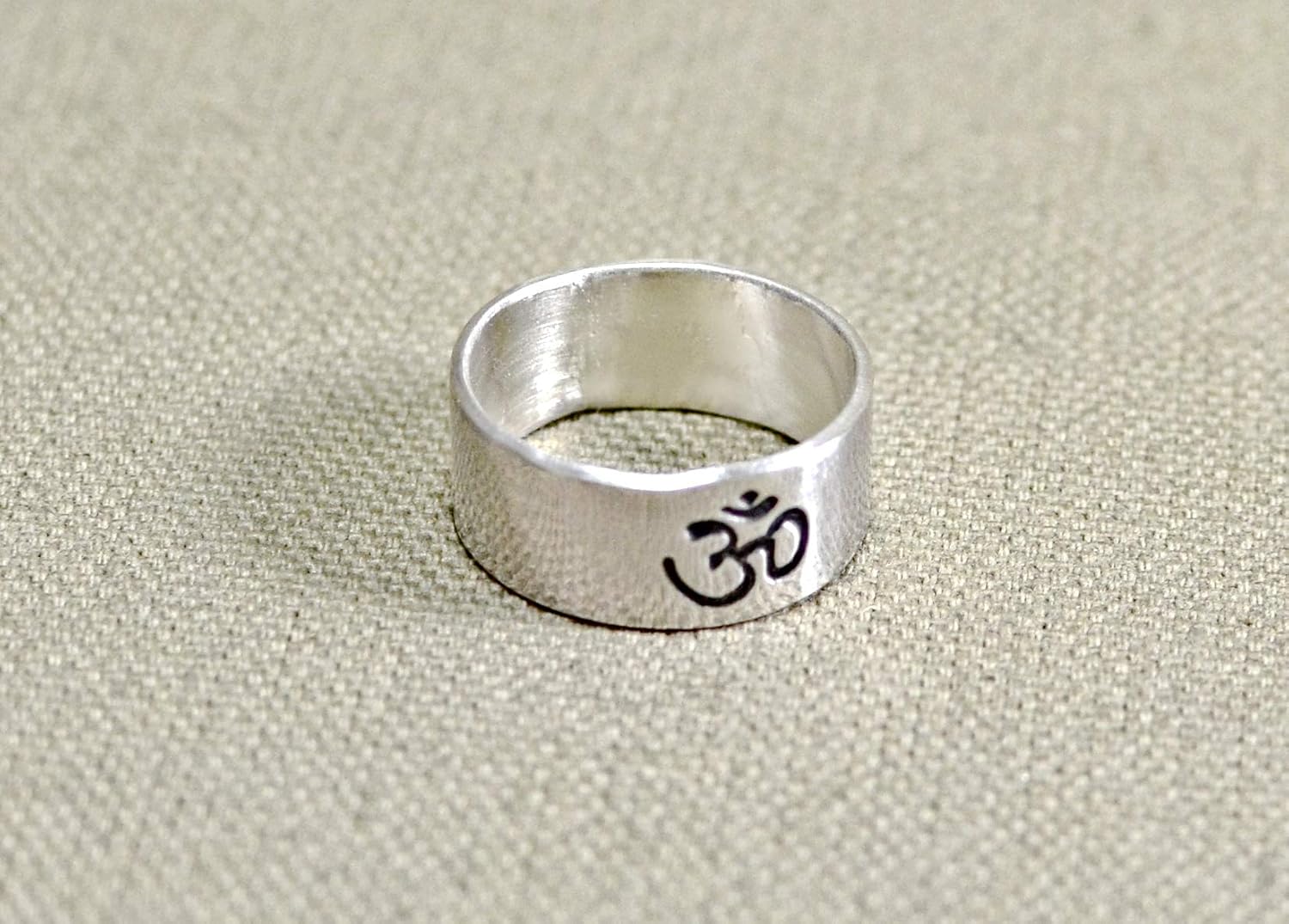 Summoning Om power from deep within, this sterling silver yoga ring with a brilliant mirror finish and Om Symbol with Namaste on the inside stamped in the metal will bring a silver radiance to your finger. The ring measures 3/8 in wide and was cut by hand from 18 gauge sterling silver to give you some real substance without being overly bulky or large. After cutting and stamping the flat ring band, the band was hammered over a steel ring mandrel with a nylon mallet until the ends are perfectly aligned. Using sterling silver solder and an acetylene torch, I soldered the ends together and shaped the soldered band into a perfect ring on the steel mandrel. Any rough edges along with the seam are filed smooth and a black patina was brushed into the Om symbol for contrast against the vibrant silver glow of hand polished sterling silver. The ring is then tumbled in finely crushed walnut shells to remove any fingerprints a fine scratches in the metal. This om ring is shown in US ring size 7, but can be ordered in any ring size, by simply entering your ring size in the custom requests. I always welcome and accept custom and personalized orders. You can also use this listing to create your own ring with stamped text, a unique symbol, or special design by entering your requests in the checkout notes.
