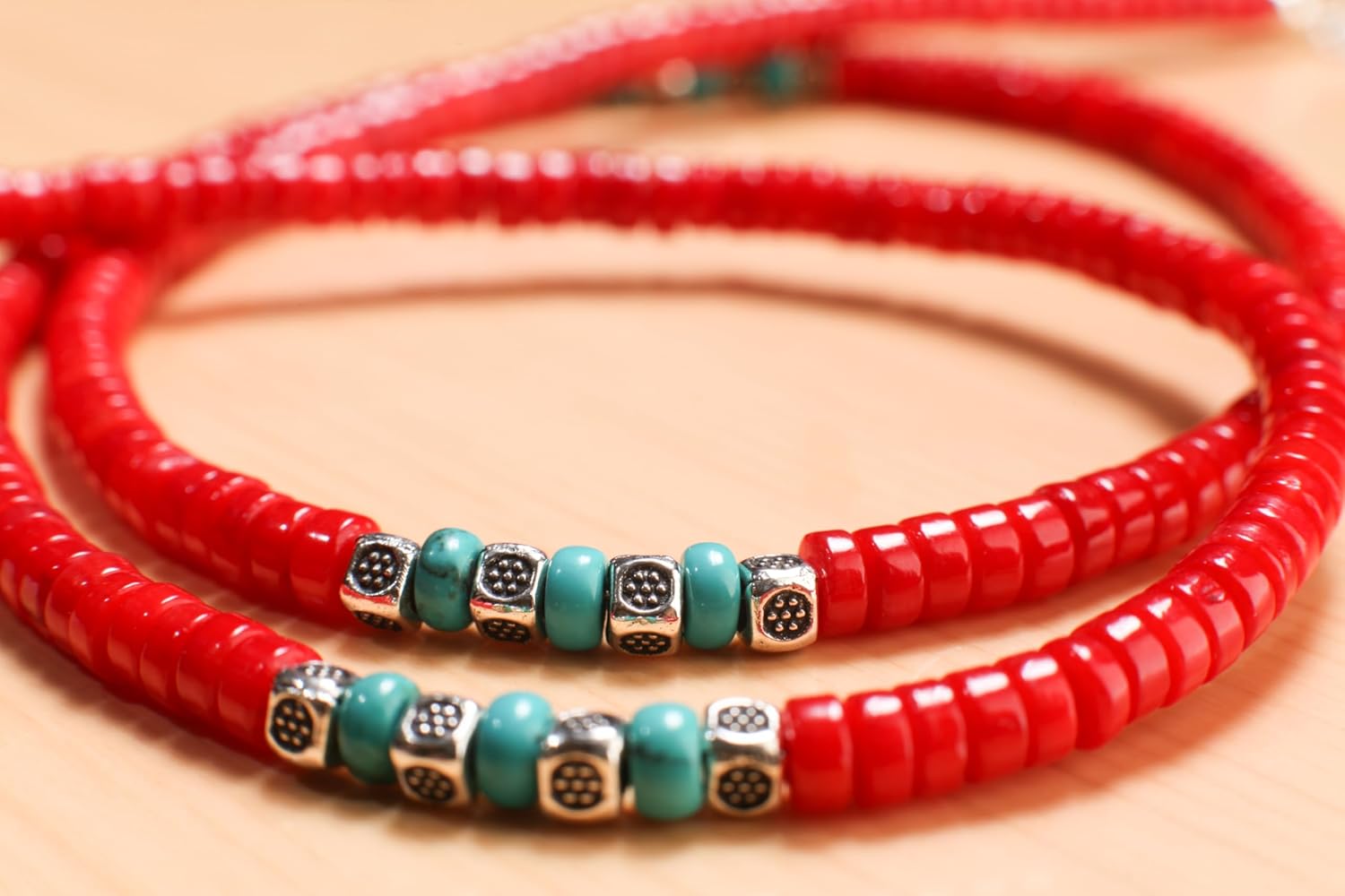 Genuine AAA Red Bamboo Coral Heishi and Turquoise 4mm Rondelle Spacers Necklace, 4mm Bamboo Coral Heishe Choker 16" to 30" Necklace Picture Shown 22" Necklace